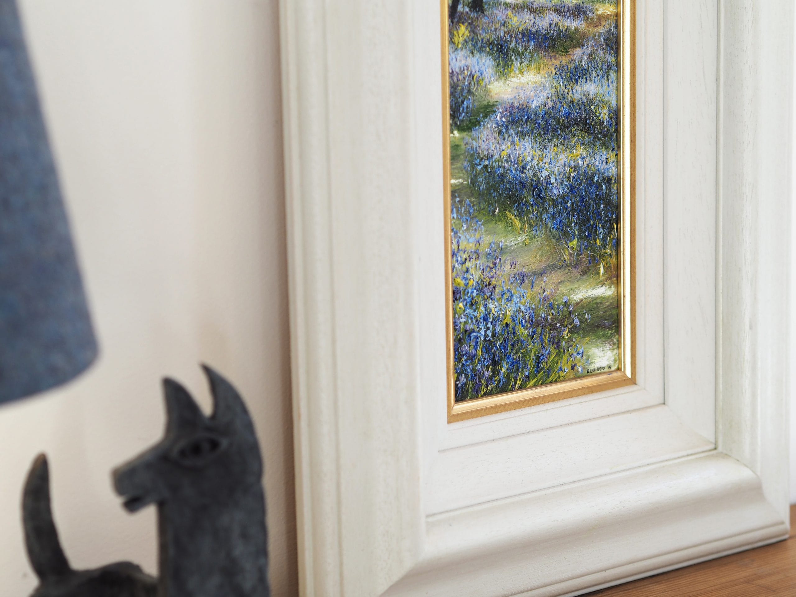 To say we were excited to see this piece is an understatement. The light achieved throughout in this magnificent piece of original oil on canvas, really entices one to walk into and along this meandering path. We love everything Mark does, but this is definitely one of our favourites. This piece is the perfect shape for a narrow space, a landing perhaps or for sitting prettily on a shelf, mantlepiece or bookcase, the way we have captured it here.
