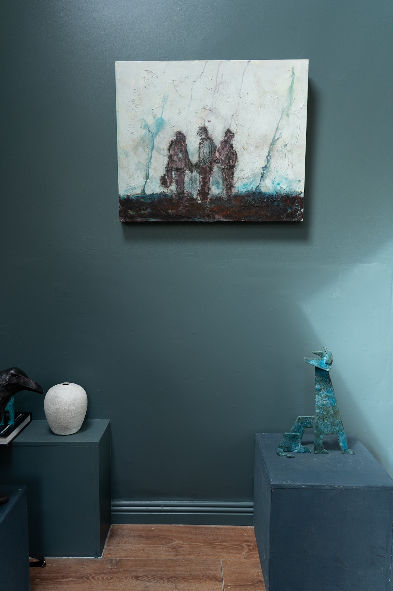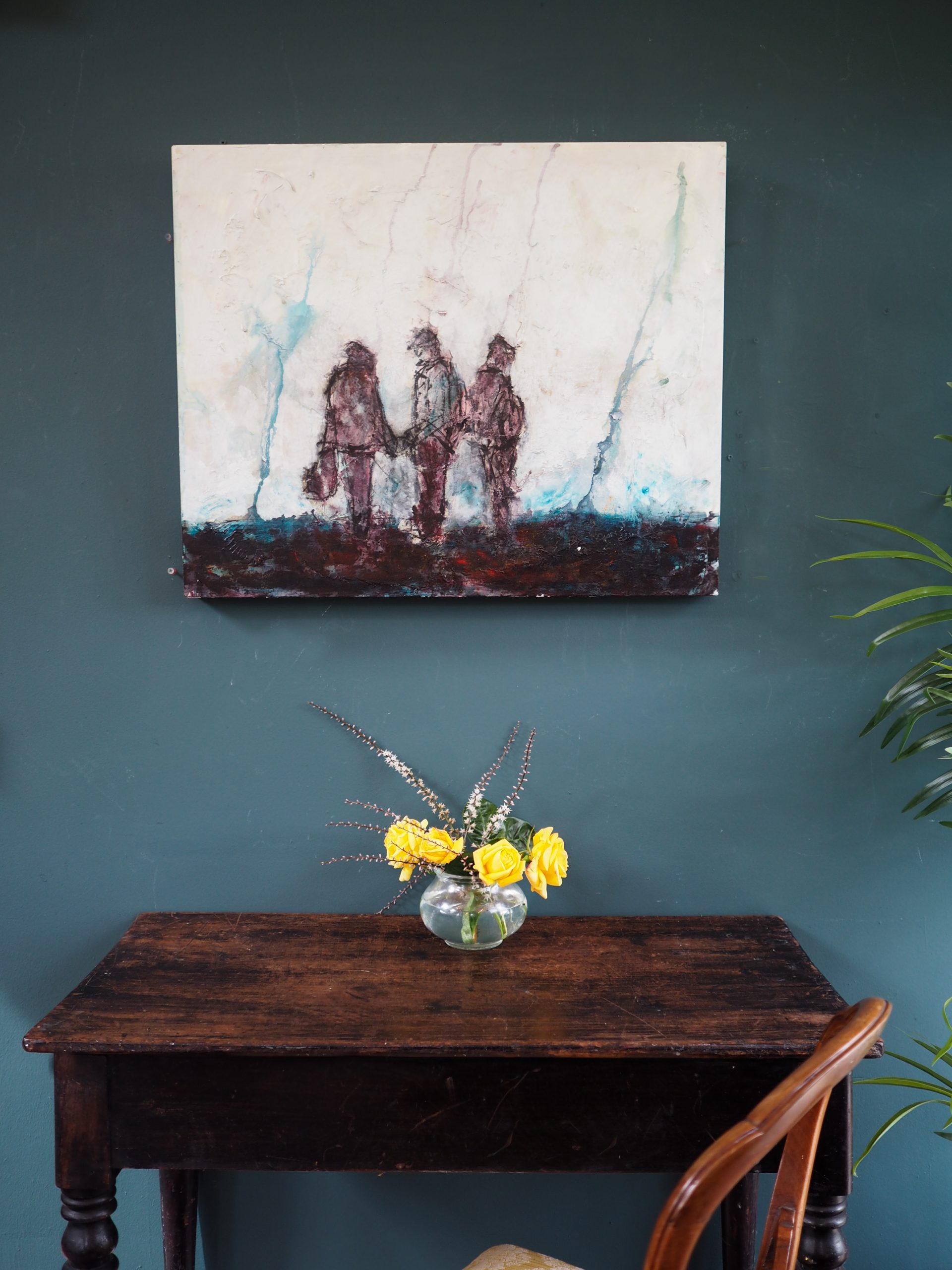 What a superb piece of original art by an incredibly talented and very collectable artist. Danny Vincent Smith, a native of Co Cork, is one of Ireland’s most interesting contemporary artists. His style is bold, confident, free and his knowledge of colour is unreal. With a real Yeats feel to this painting, it depicts three male figures, standing, chatting together. Everything about this painting, from the colour palette, to the free, authentically raw style of painting, to the composition, screams art and the West of Ireland.