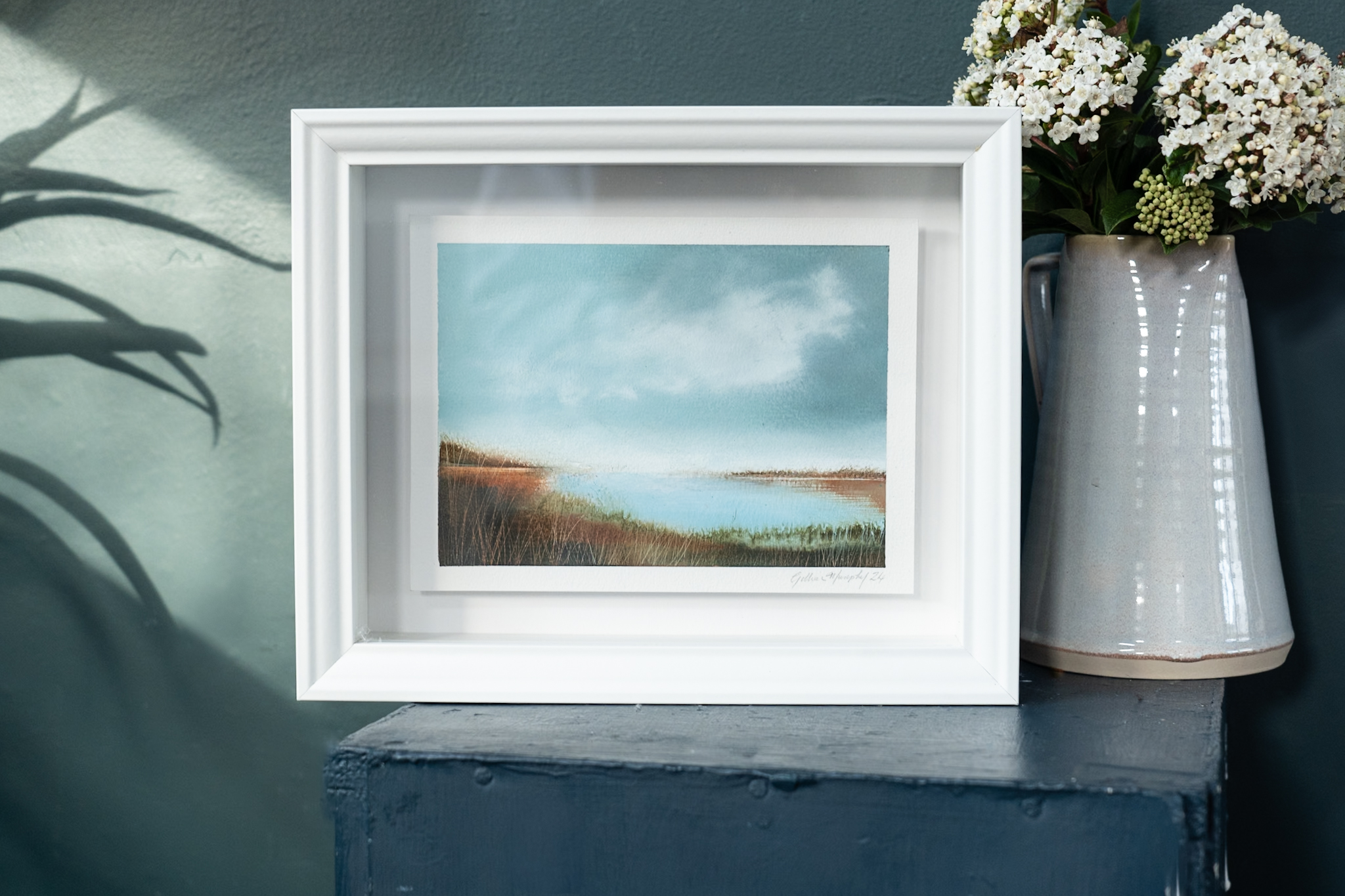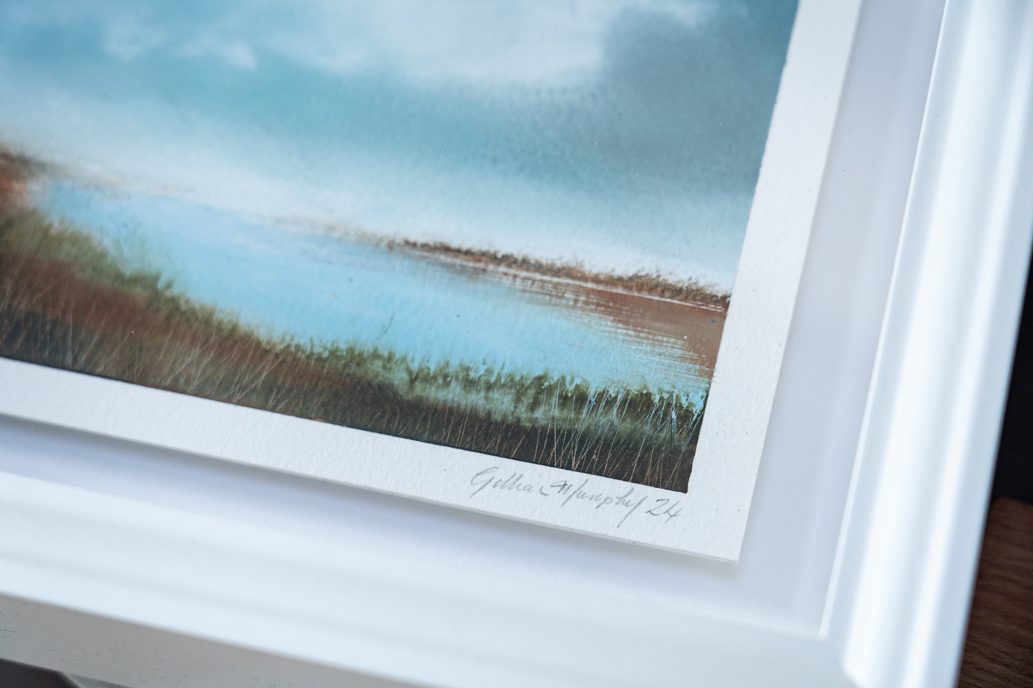 We have been eagerly awaiting this latest collection of works from the extraordinarily talented, contemporary artist, Gillian Murphy. Her competent and delicate hand is instantly recognisable and her handling of colour, exquisite.  ‘Morning Solitutde’ is a beautiful and sweet piece that captures the still and mindful beauty and absolute sense of calm, of a moment in nature, in the early morning. It is a special piece, on it’s own, but is even more so, alongside its sister piece, ‘Evening Solitude‘.