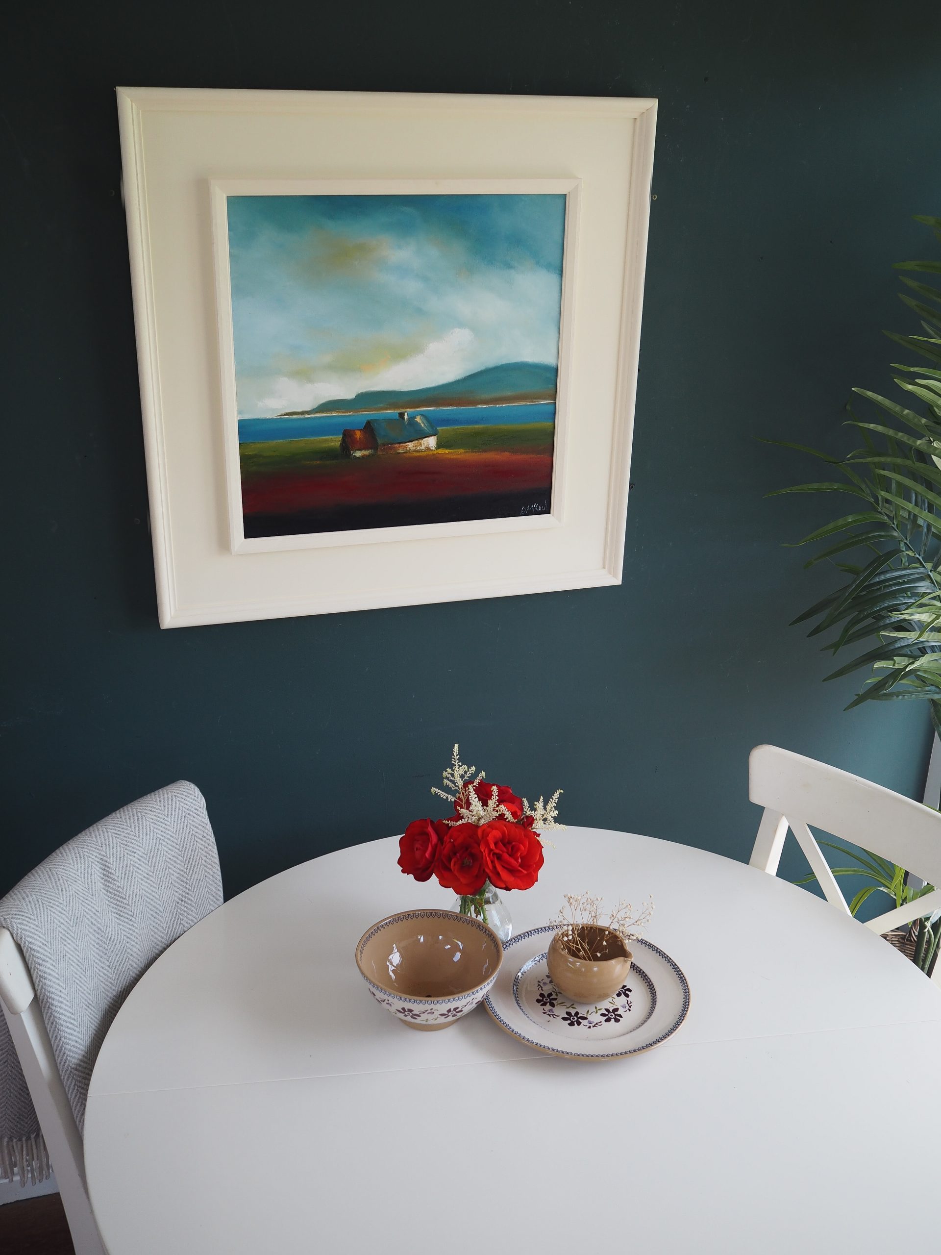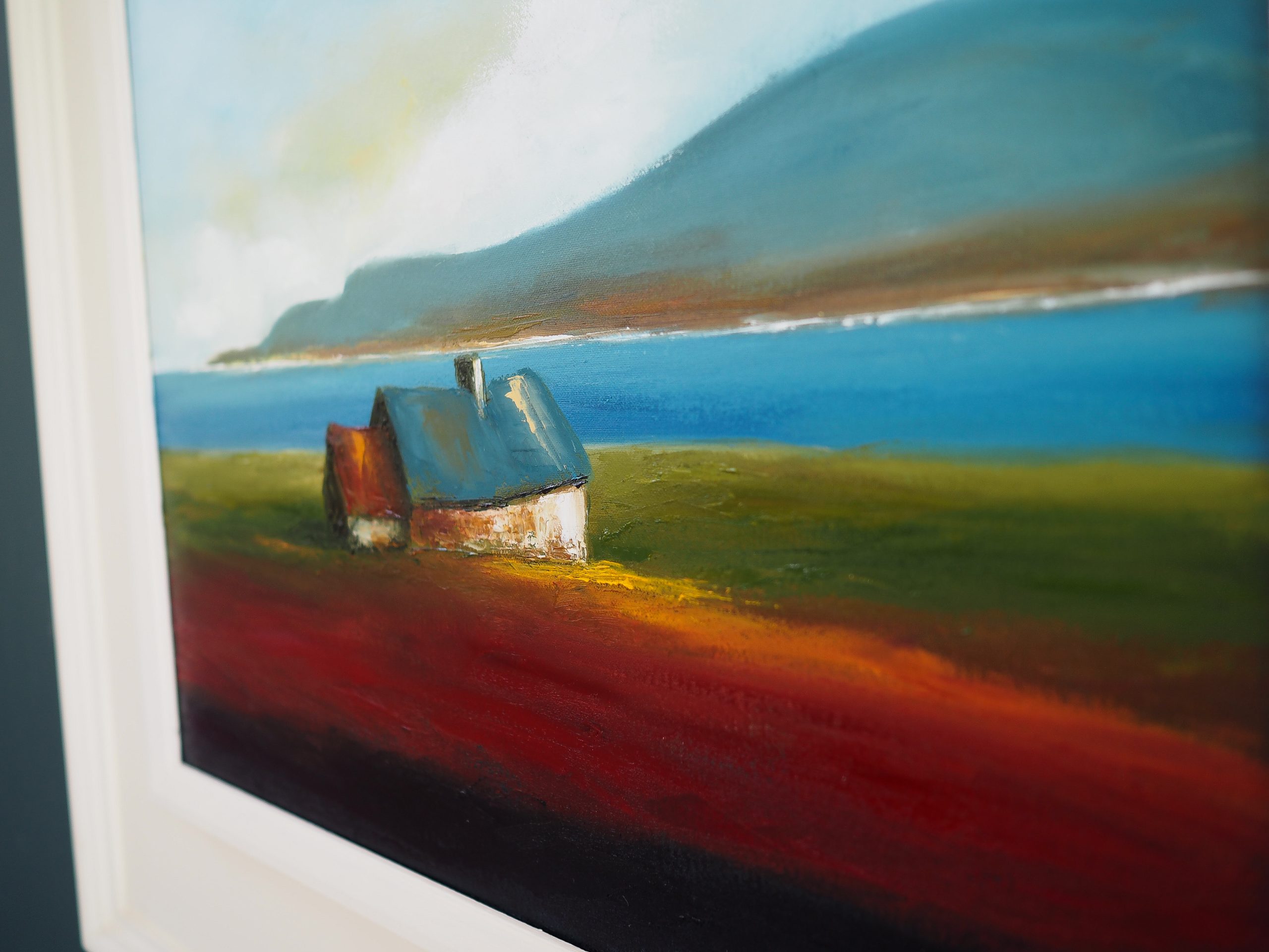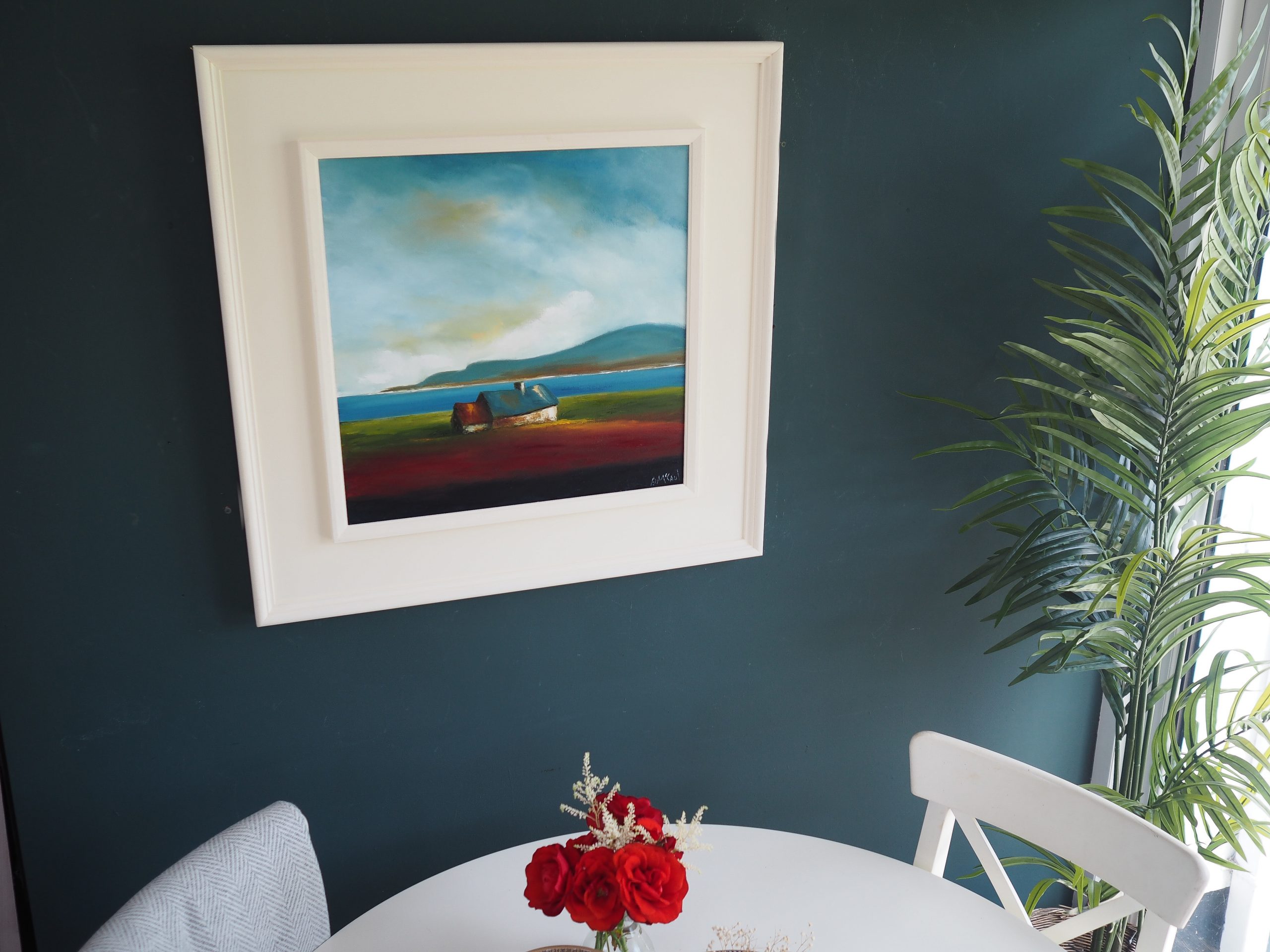 ‘On the Atlantic Coast’ is a gorgeous McCaul depiction of a small cottage and leaning shed, nestled into the countryside, with the mountains and Atlantic Ocean in the background. McCaul’s gorgeous, rich, colour palette and fabulous compositions make for really impactful work. This is a brilliantly impactful piece of art on the wall.