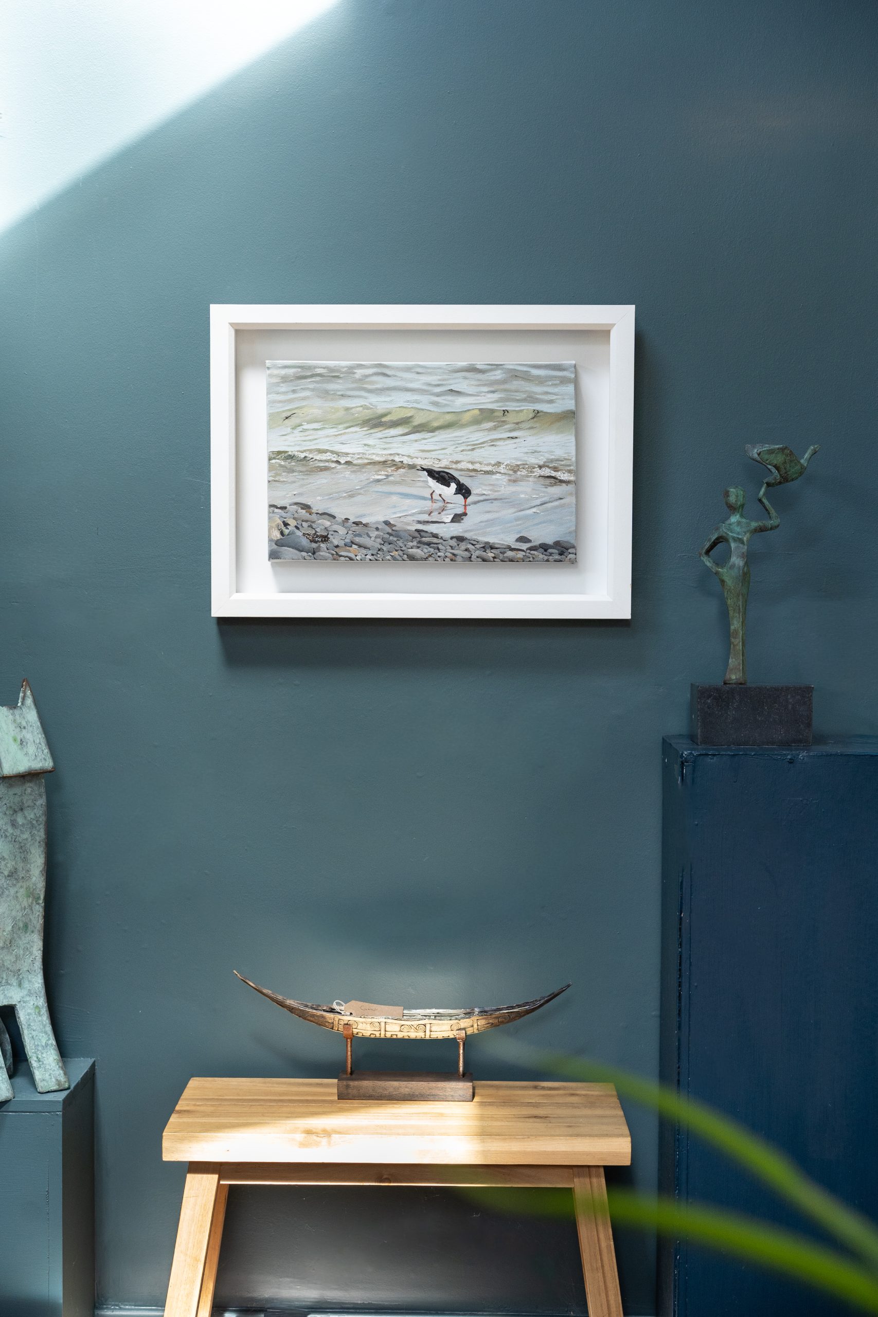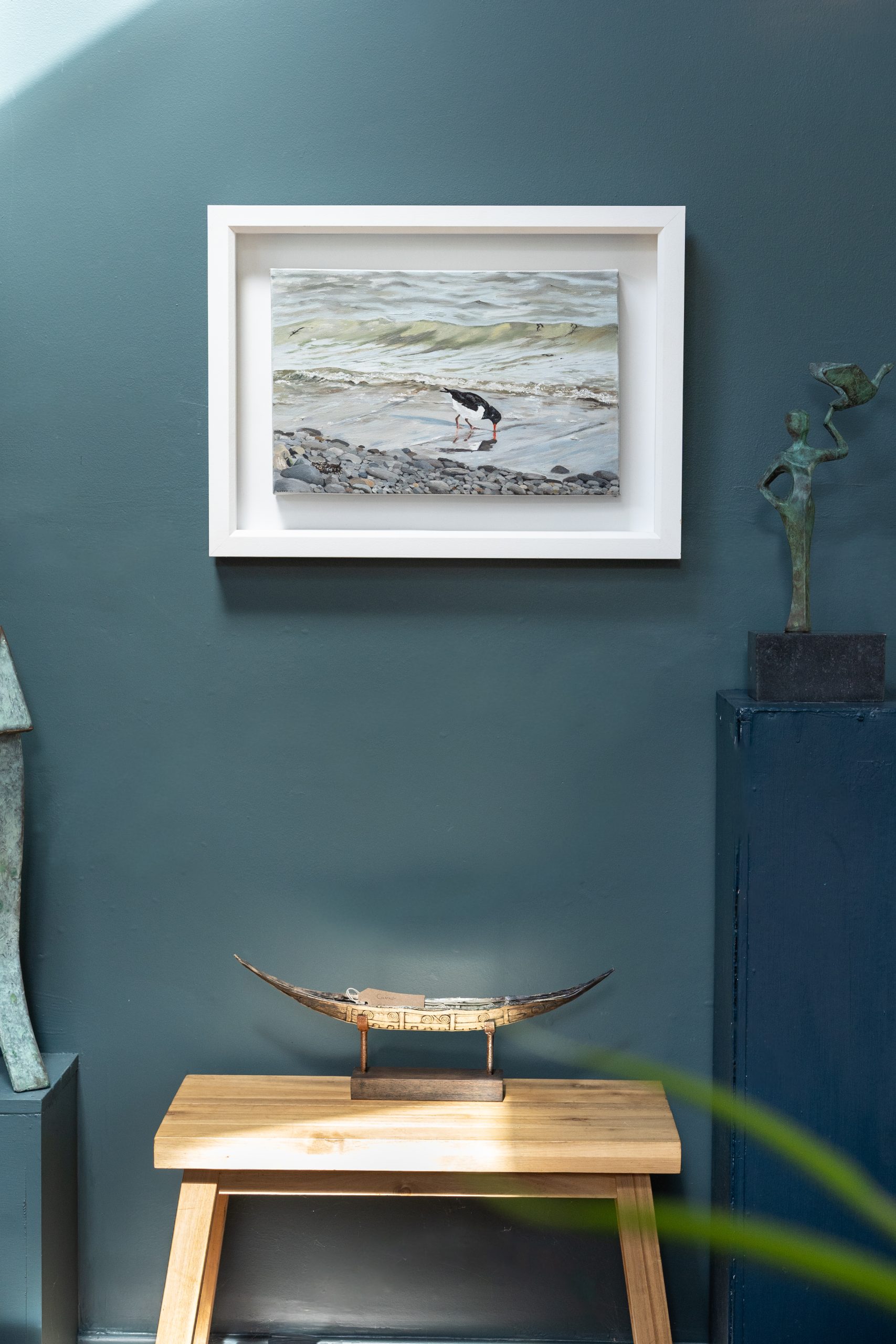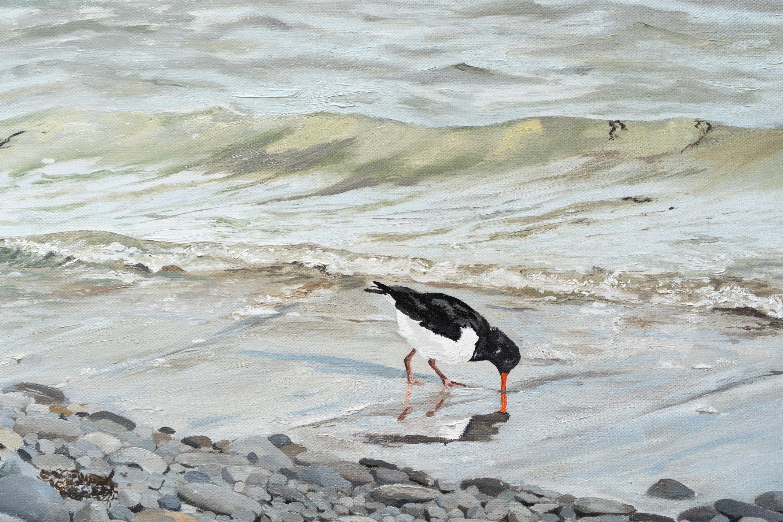 A gorgeous original oil painting by the artist ‘D’ – this time, of the clever Oyster Catcher at work on the beaches of West Clare. Distinctive in appearance by their black and white bodies and long orange beaks, the oyster catchers are a fairly regular sighting in the West of Ireland. But this artist also captures here in oils, with superb accuracy it must be said, the perfect colour, movement and depth of that incoming tide. Beautiful piece of work.