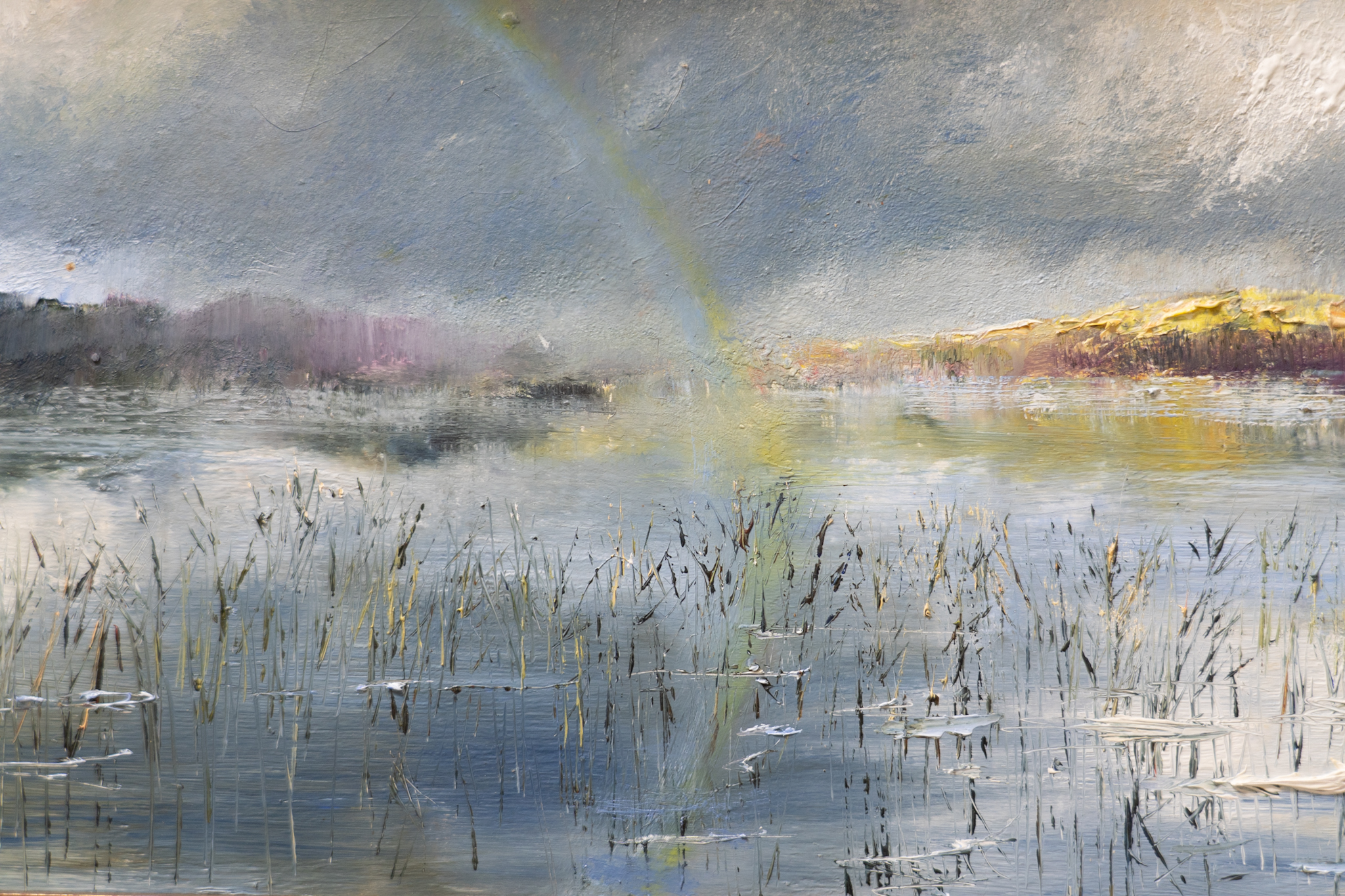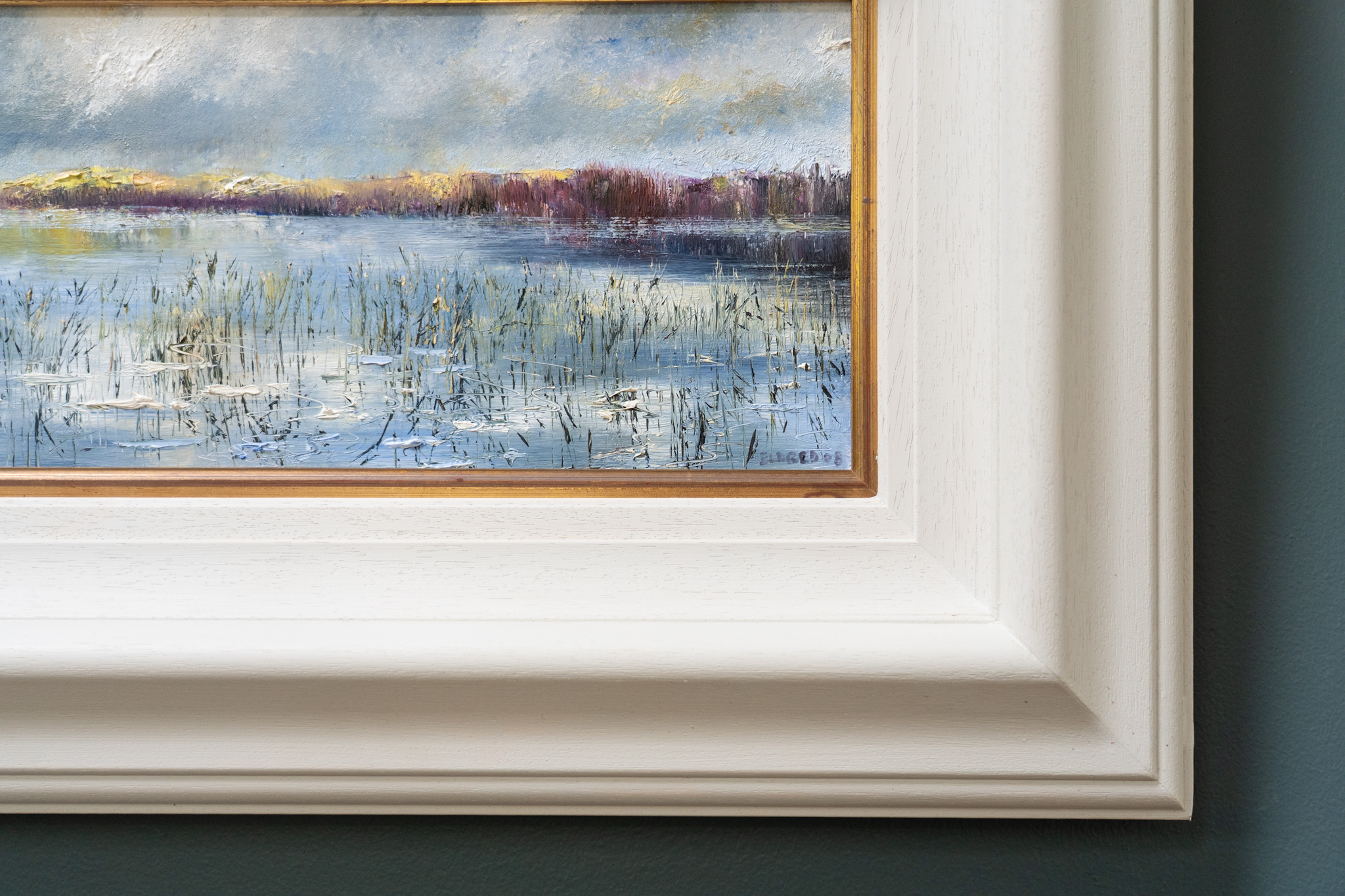The beautiful, thick layers of oil, that form a part of the incredible journey of a Mark Eldred original, are raised and prominent as each and every element in the painting gets the same attention and the same love from this awesome artist. ‘Rainbow over Muckross Lake’ is another striking Eldred original that quite literally takes your breath away. Majestically framed, this is a large and powerful piece that makes for a very striking addition to any space. This impressive painting, with its gorgeous and rich colour palette and long, landscape shape, really stands out. Like every Mark Eldred piece we have ever been lucky enough to be around, you could almost walk right into it, its so beautifully realistic, with its fabulous detail and uplifting shafts of sunlight.
