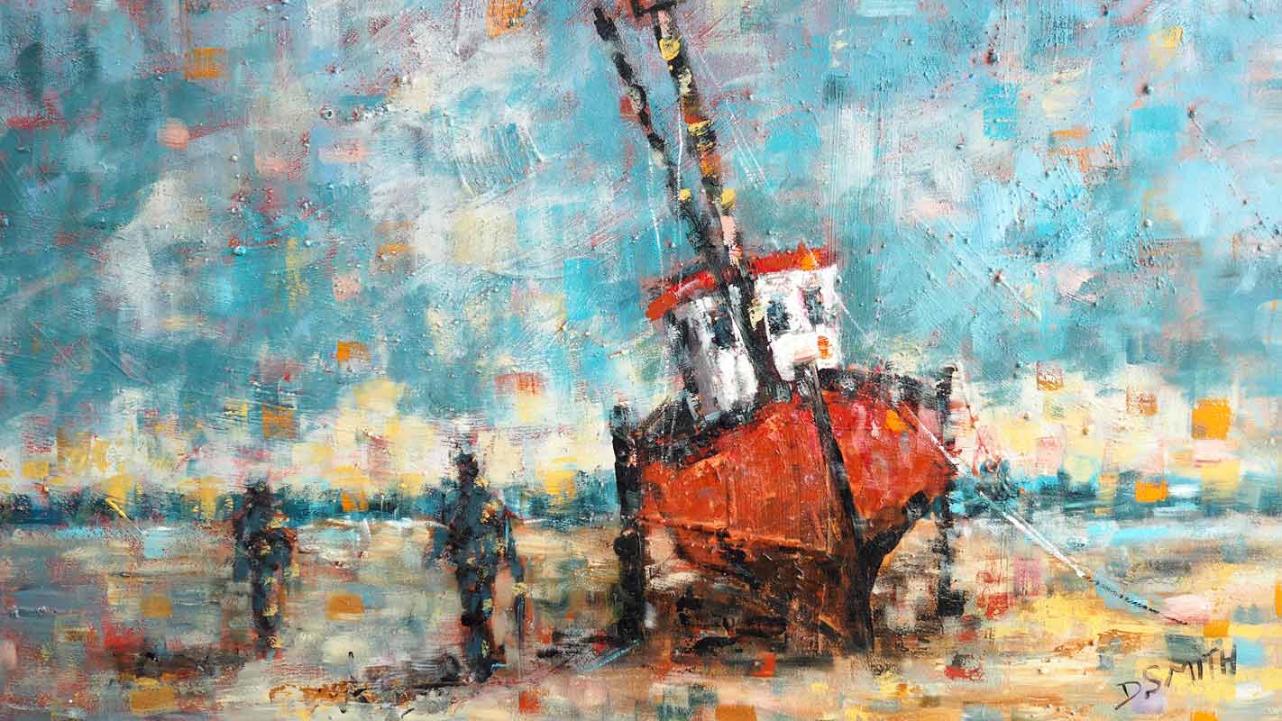 A calm, warm and fuzzy feeling emanates from this gorgeous almost soft focus painting of a fishing boat on the beach; left high and dry, moored on a low tide. There is a suggestion from the painting of new beginnings, as the men walk around it, preparing it – for its next voyage.