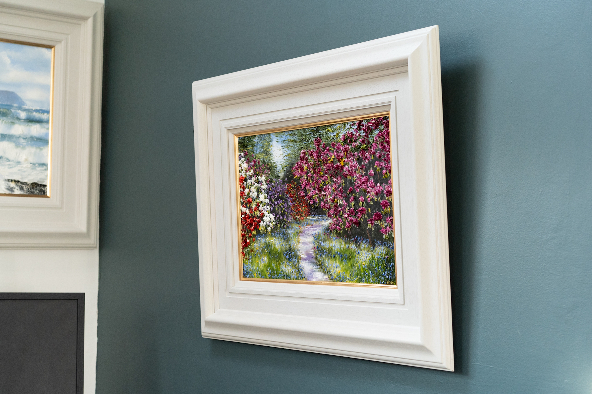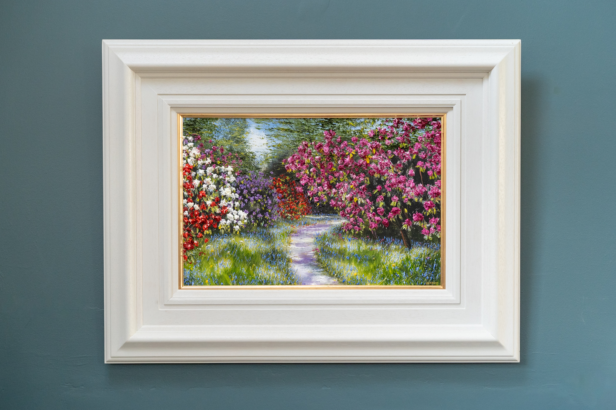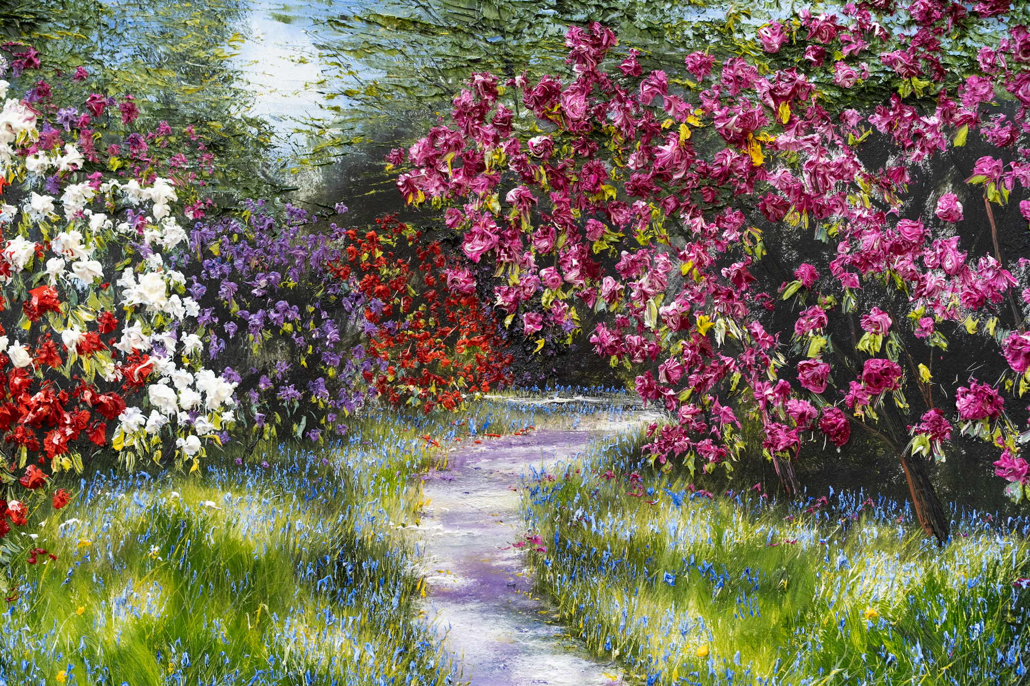 Rhododendrons and Bluebells – lining a sun lit, forest path. With bursts of vivacious colour and marvellous use of light and shade, this is the kind of painting that really transports you. You can almost hear the gentle birdsong, feel the sun on your face and get the gorgeous heady scent from the flowers.