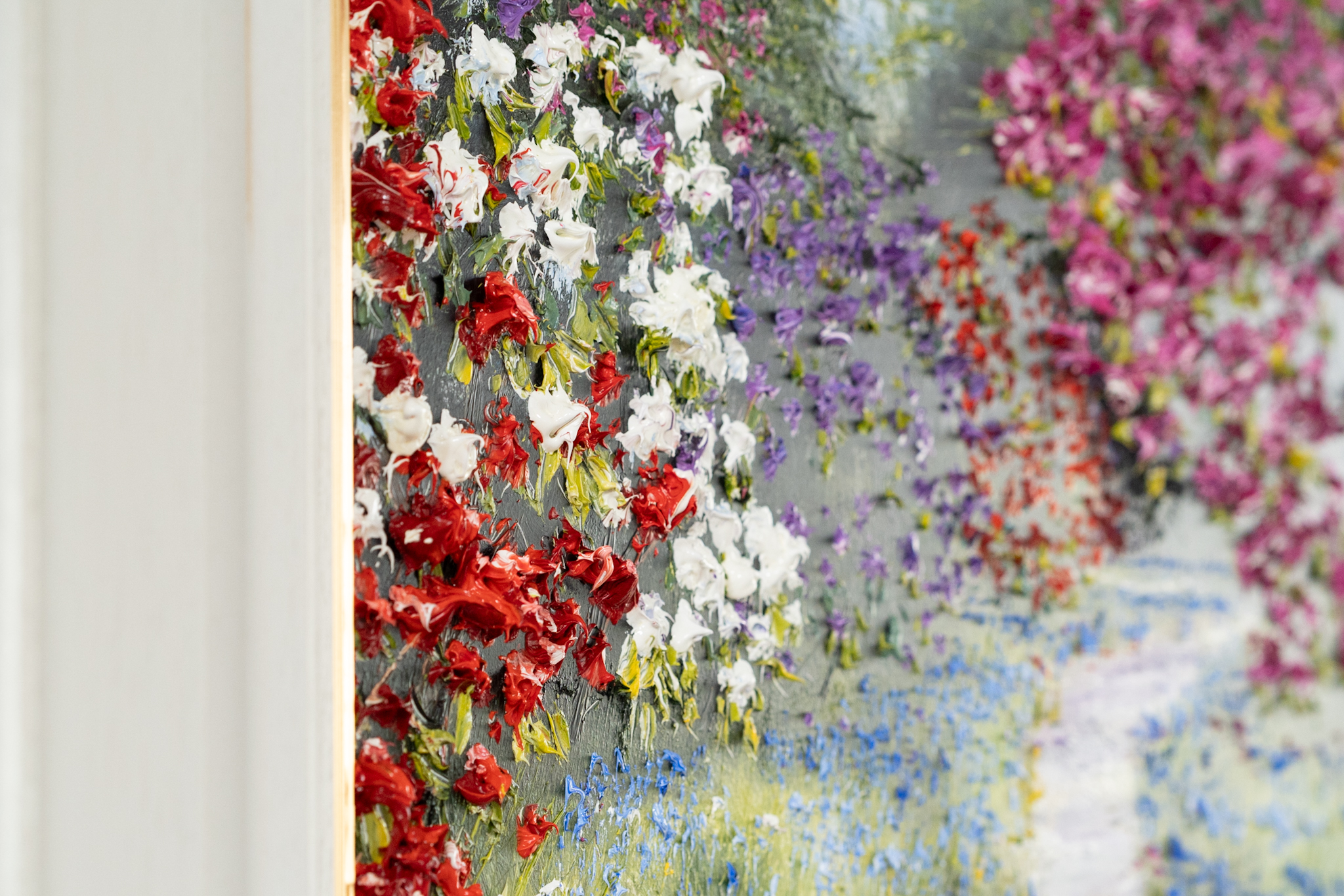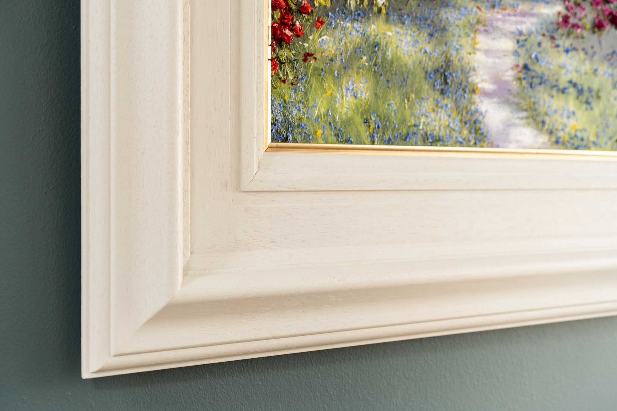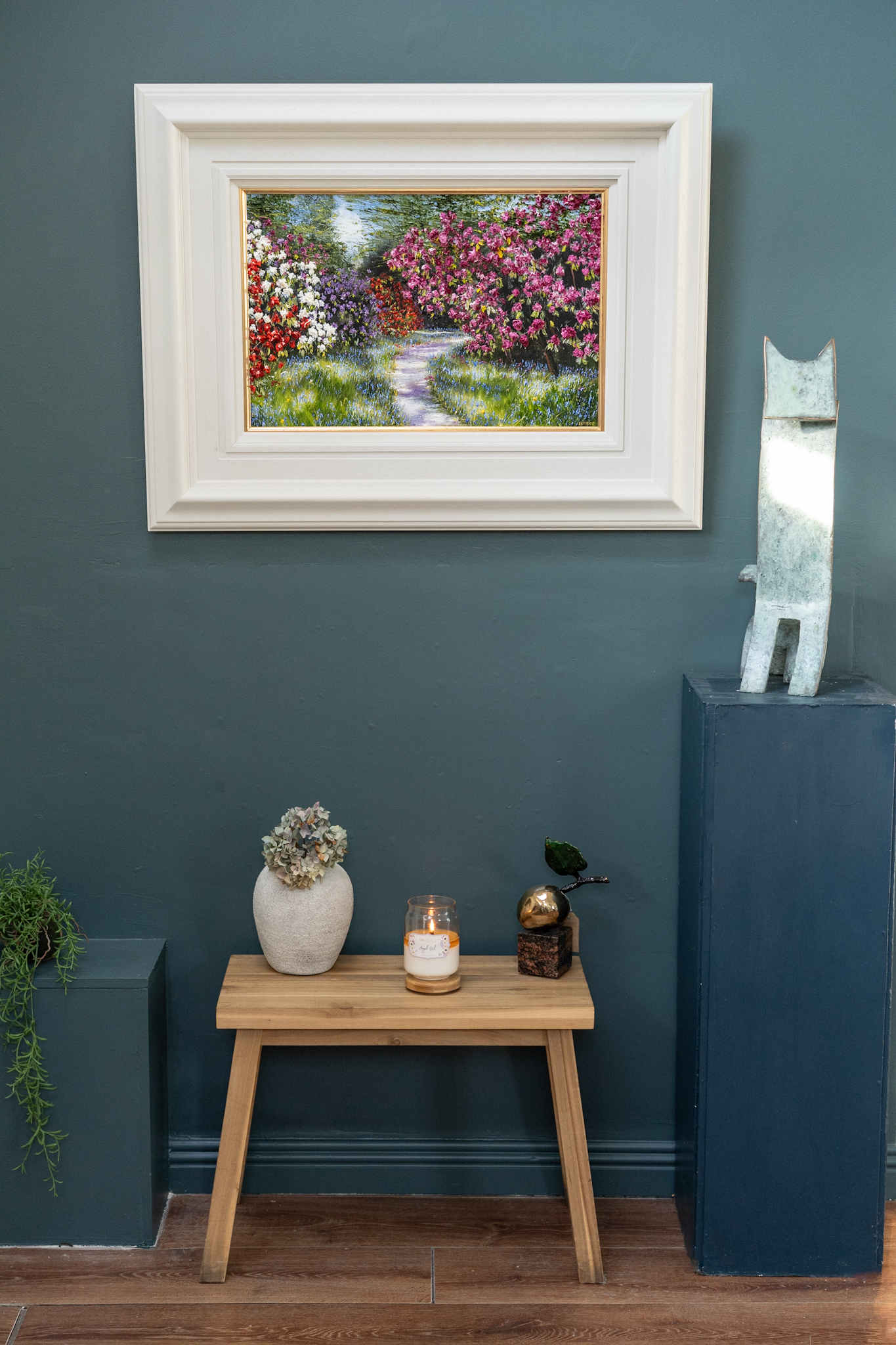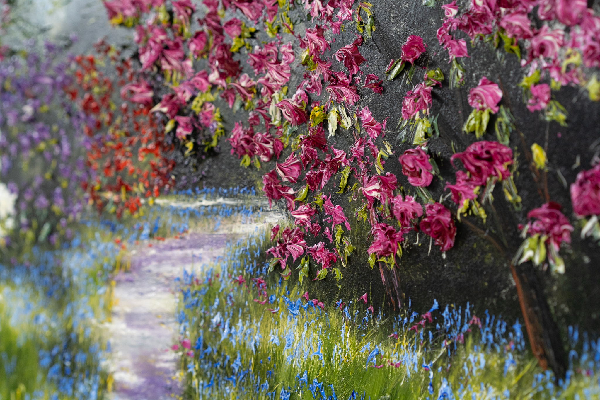 Rhododendrons and Bluebells – lining a sun lit, forest path. With bursts of vivacious colour and marvellous use of light and shade, this is the kind of painting that really transports you. You can almost hear the gentle birdsong, feel the sun on your face and get the gorgeous heady scent from the flowers.