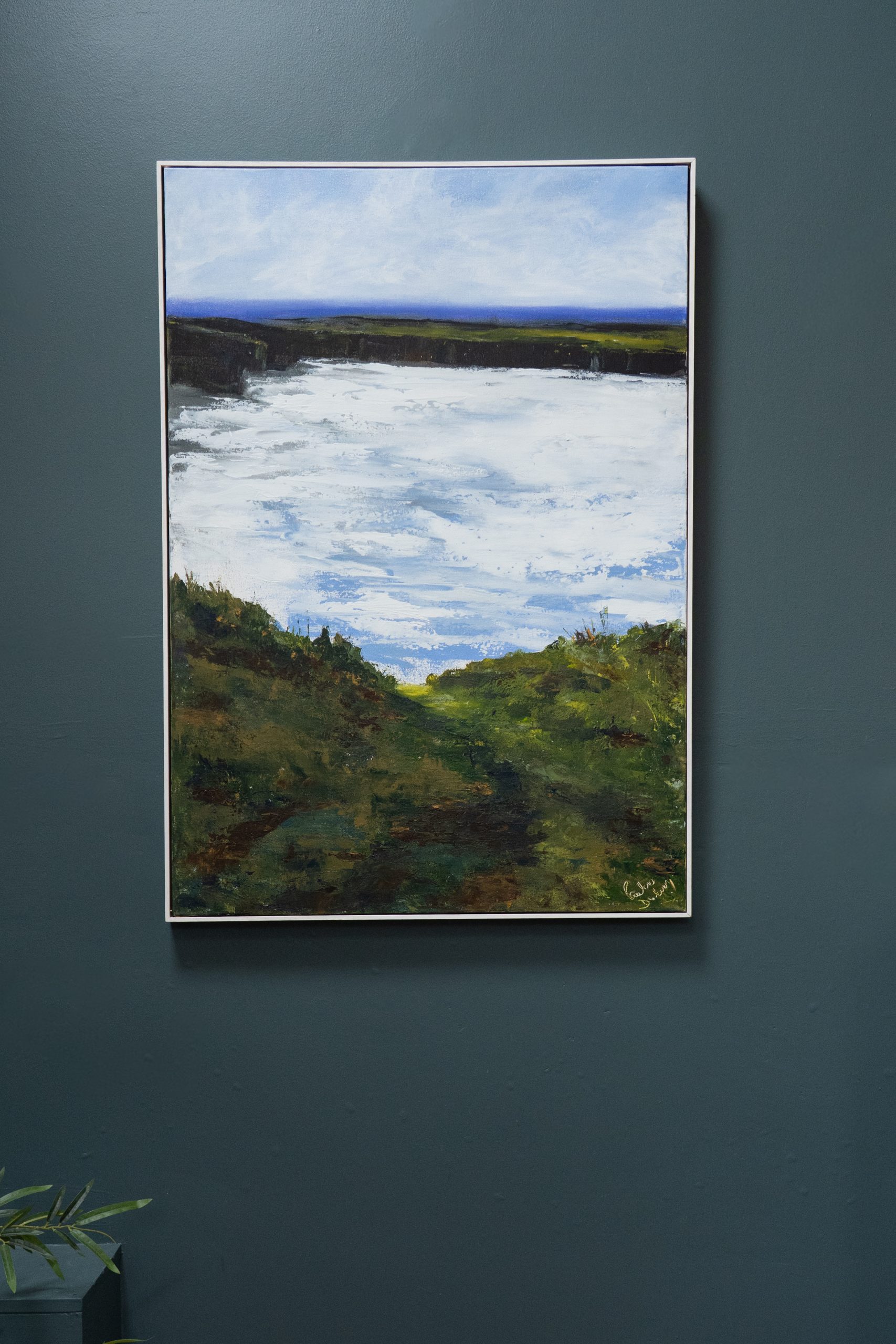 This striking original oil on canvas really captures the wildness and spirit of the ocean, and transports you to that vantage point high on the cliffs overlooking the view, This would look incredible in a beautiful big and airy contemporary space, providing a superb punch of colour and nature.