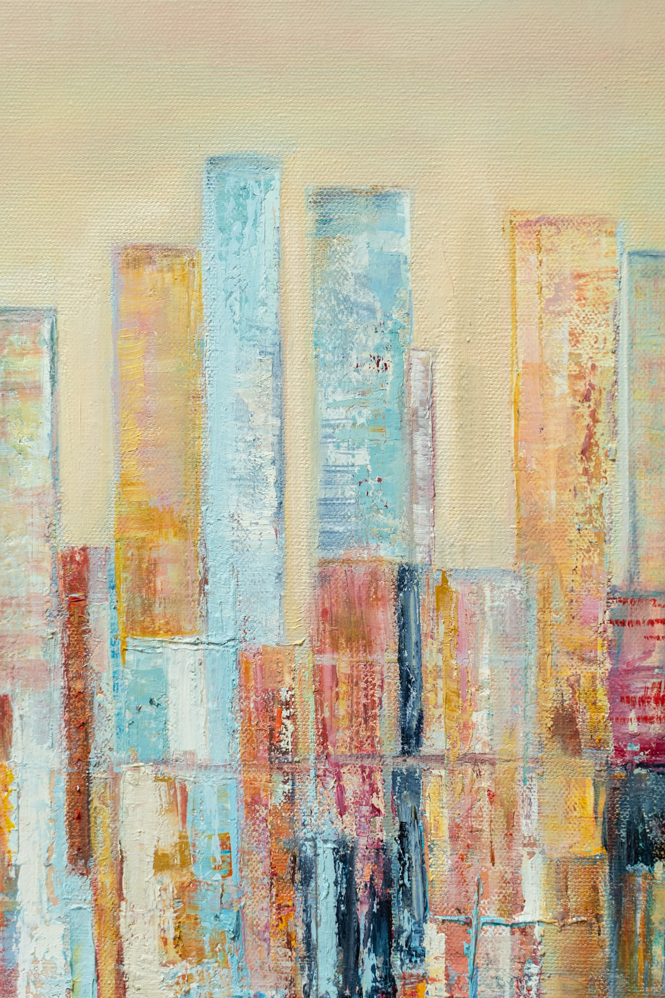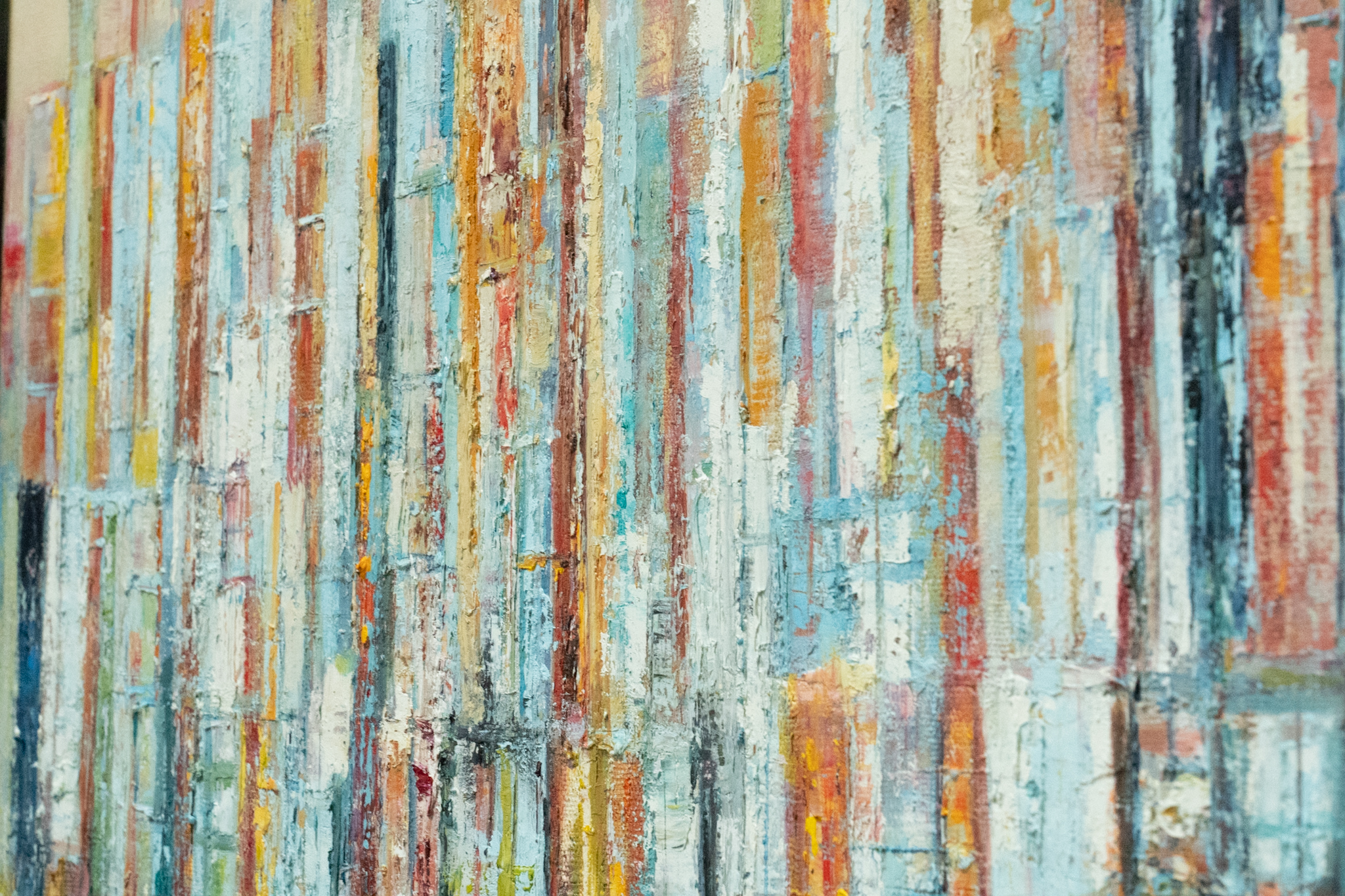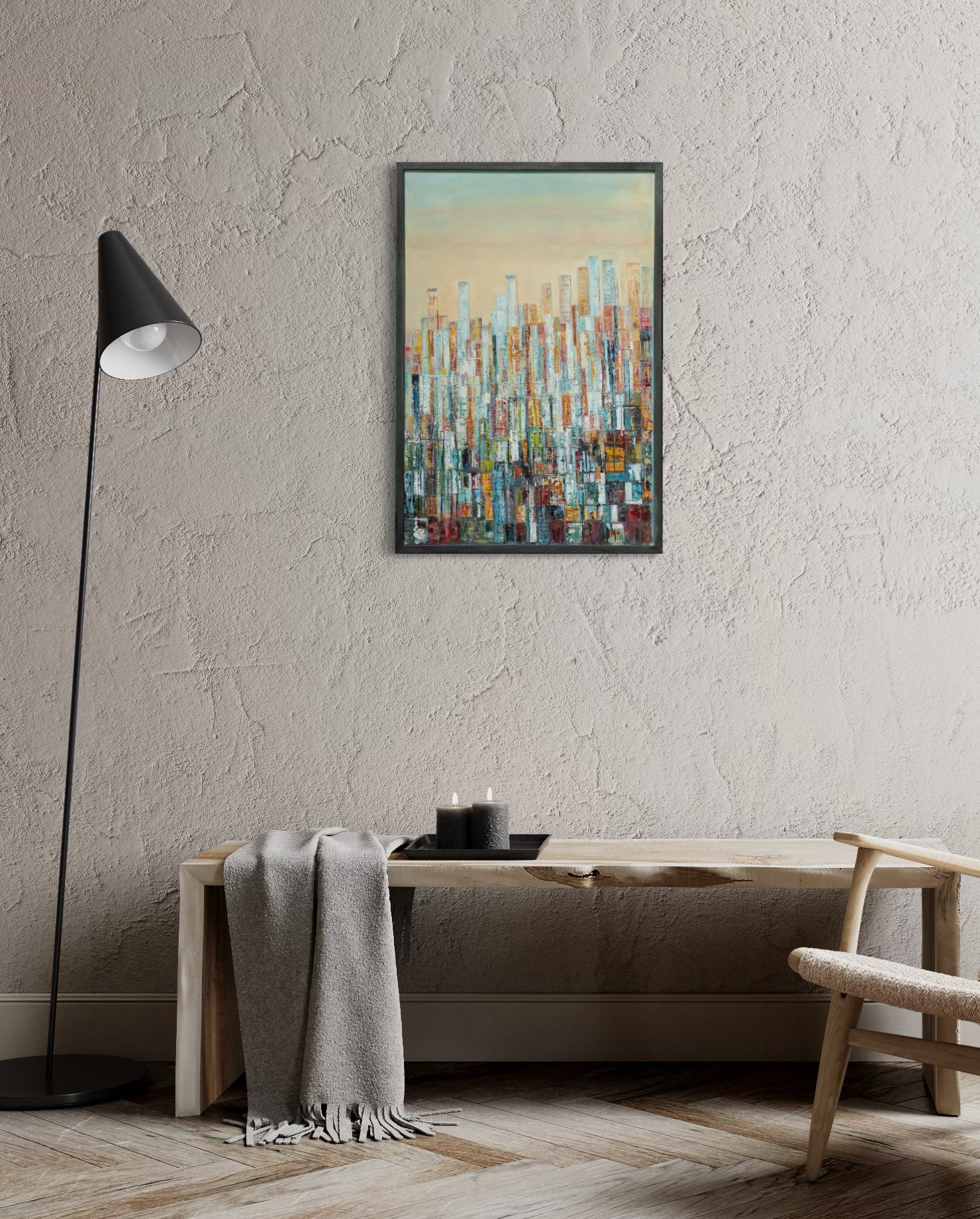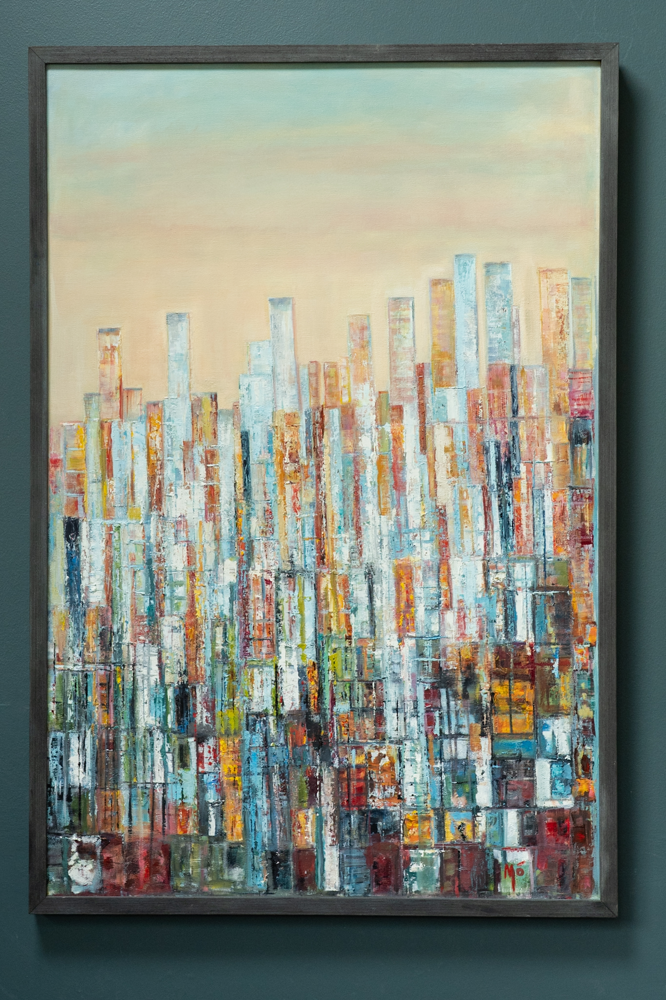 Working in oils, Moira draws her inspiration from many things, including her travels. In this instance, her contemporary take on a ‘city-skyline’ is fun, creative and exciting, and contrasts beautifully against the canvas.