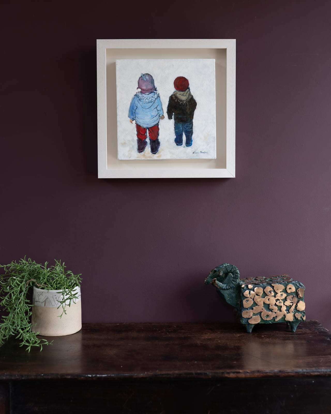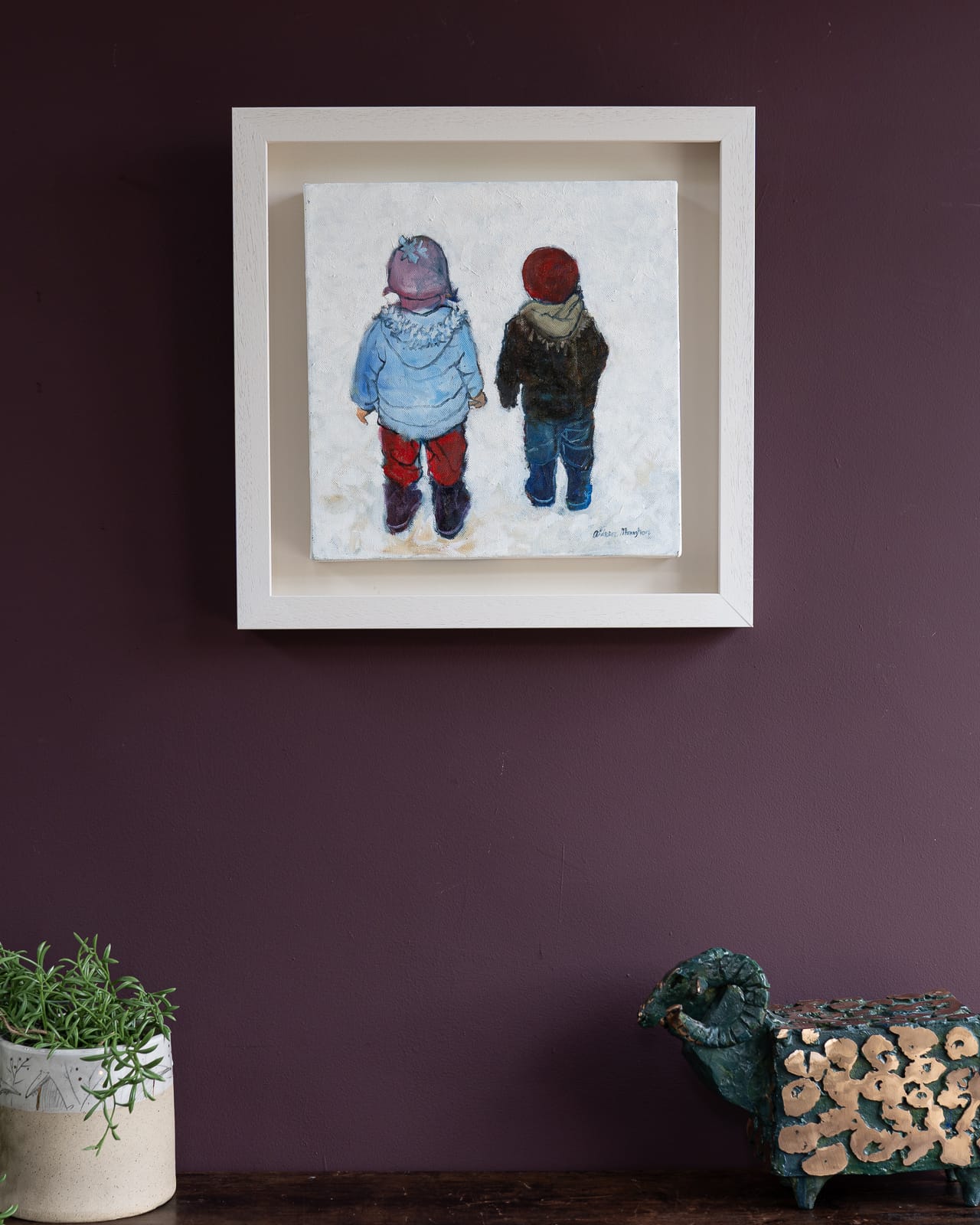 Somewhat reminiscent of the gorgeous illustrations of treasured childhood books, ‘Siblings’ is a beautiful moment, captured in delicate oils, of a sister and brother, on a walk in the country.