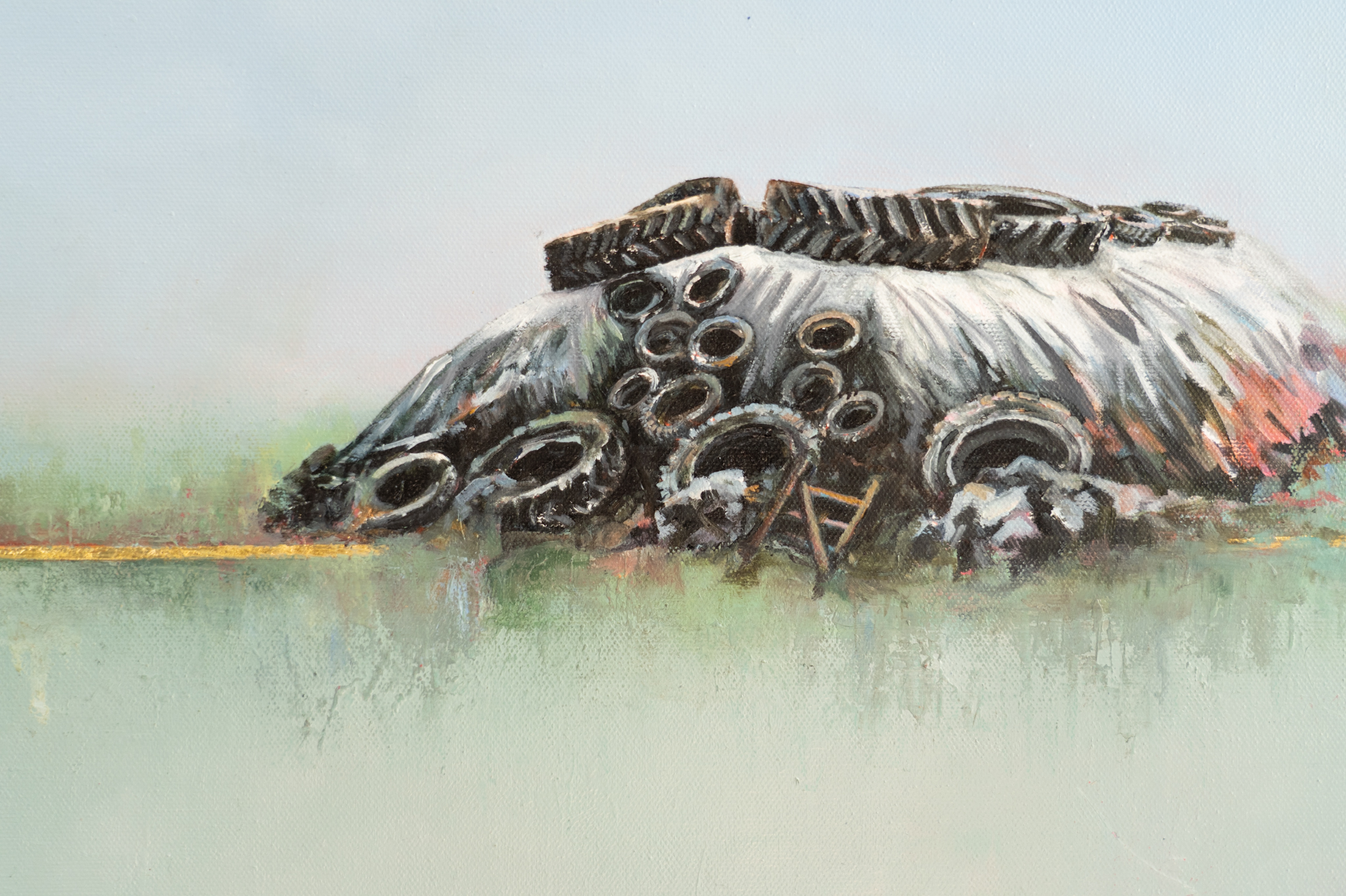‘Sileage Pit’ is a delicately depicted and incredibly detailed painting of that quintessentially rural scene; the famous evening of covering the pit, when all the neighbours would come to help the farmer get the sileage covered in time. Complete with her signature gold leaf line, and her meadow like background, its a truly exquisite piece of original art.