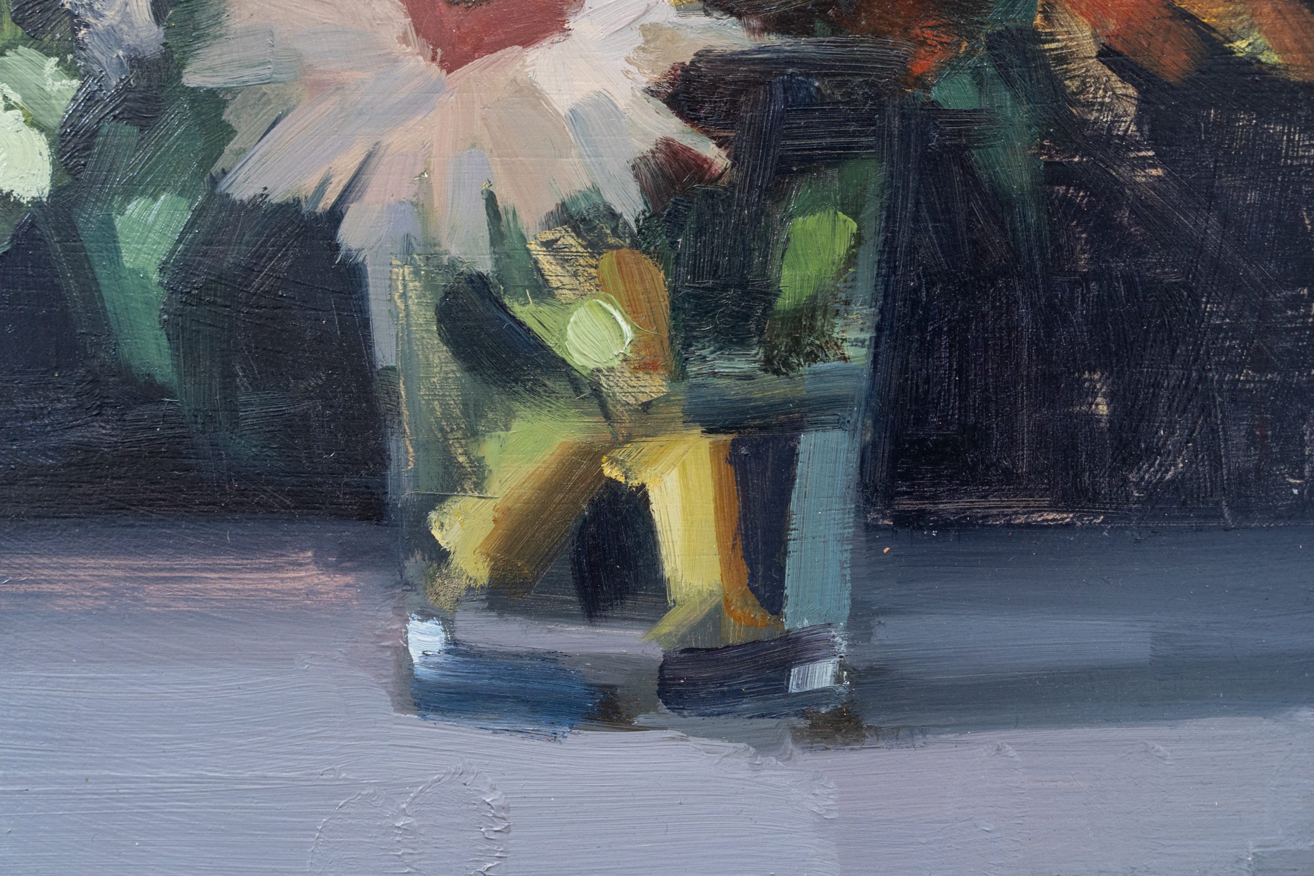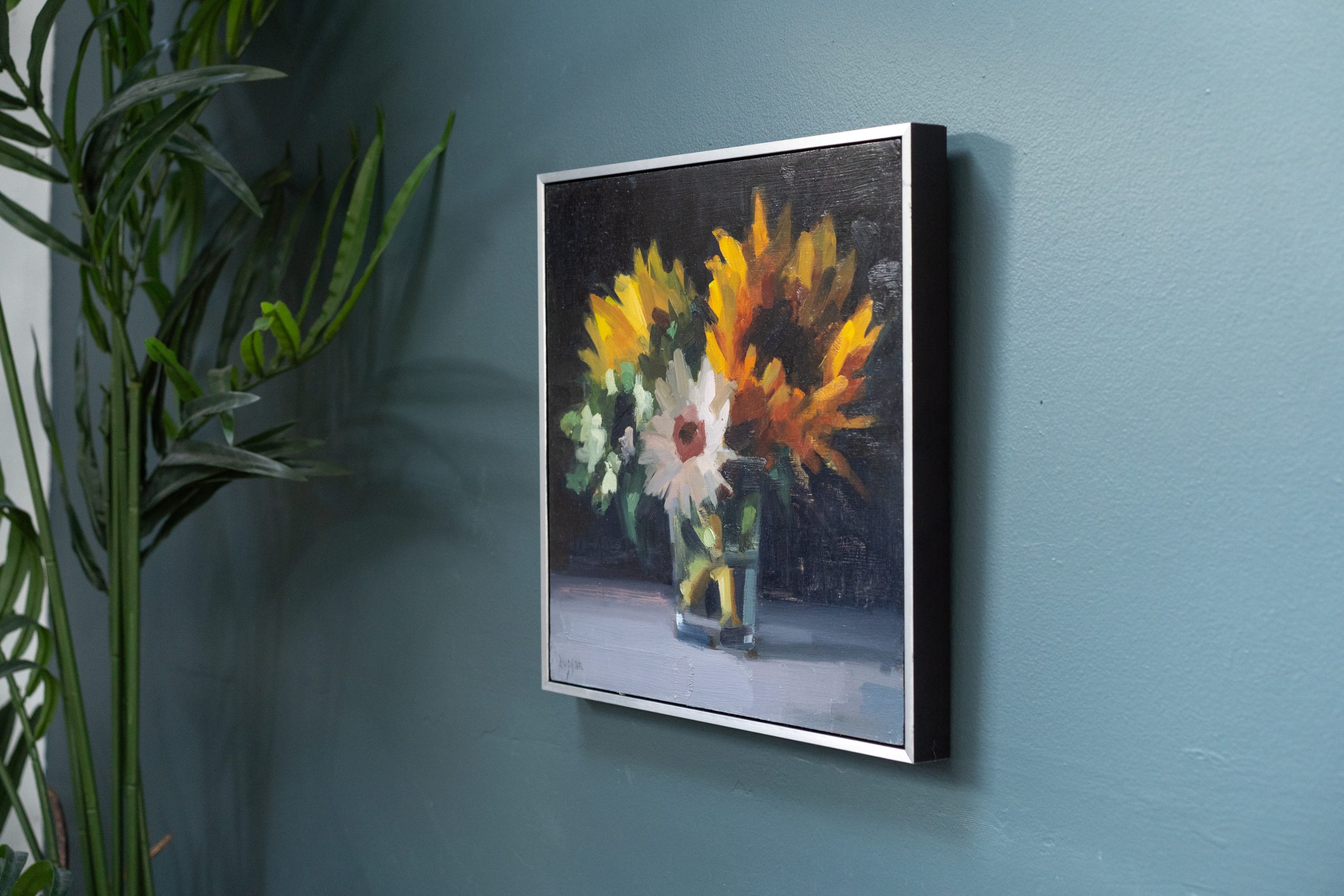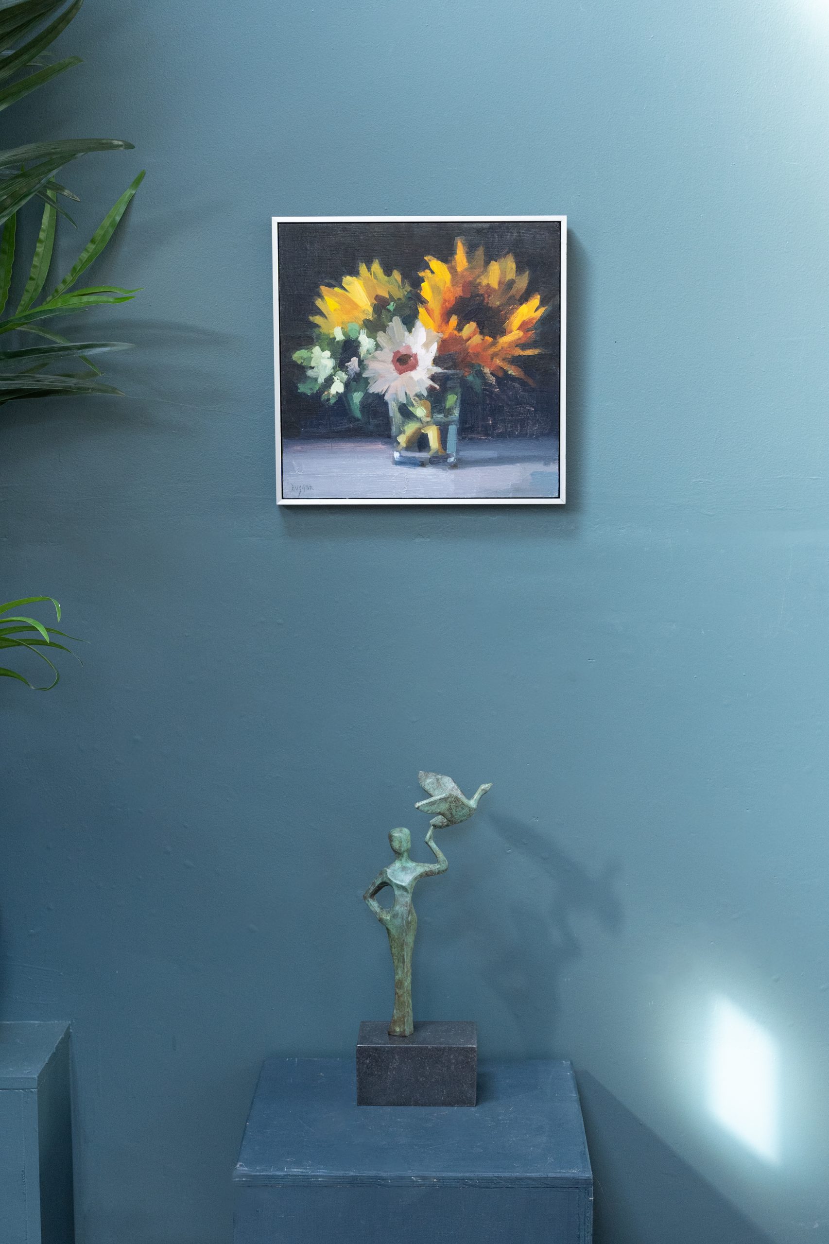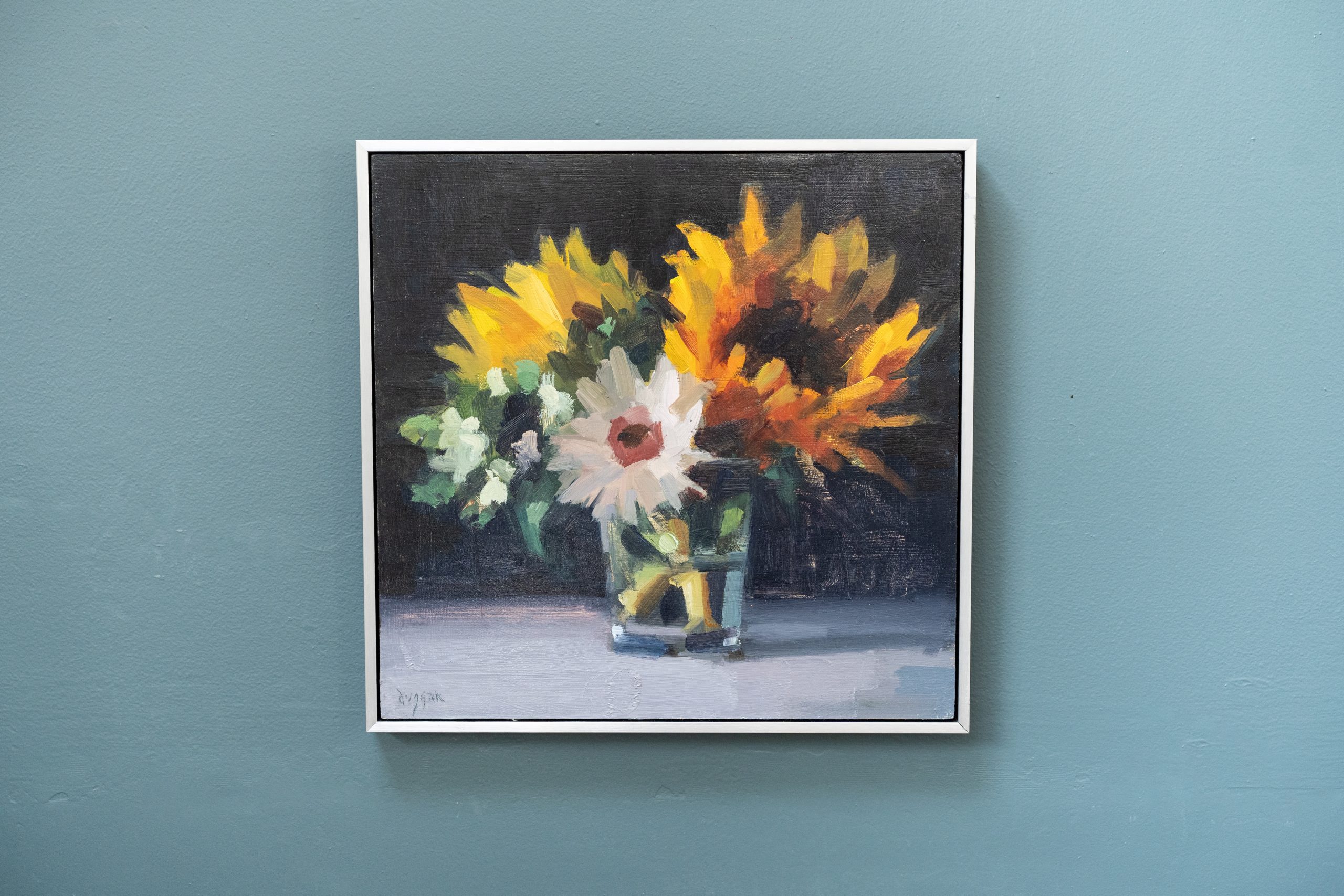 We have become obsessed with this stunning sunflower spray by contemporary artist Bairbre Duggan. The depth, the handling of colour, the contrast with the dark background, the water in the glass; It is just superb.