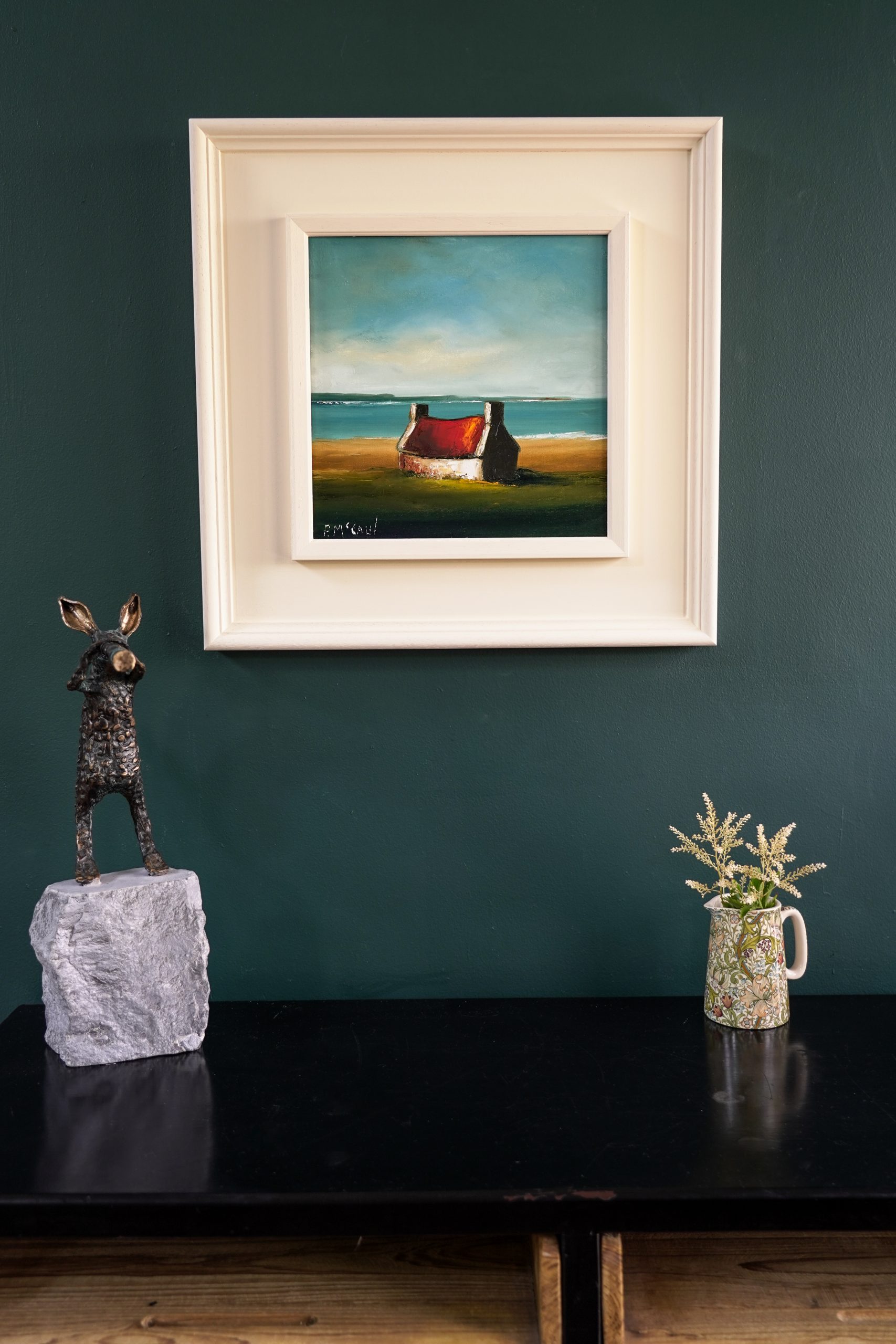 A sweet white washed cottage, with it’s red tin roof, overlooking the ocean. ‘Sweet Home’ is a stunning piece of original art that makes such an impact on the wall.