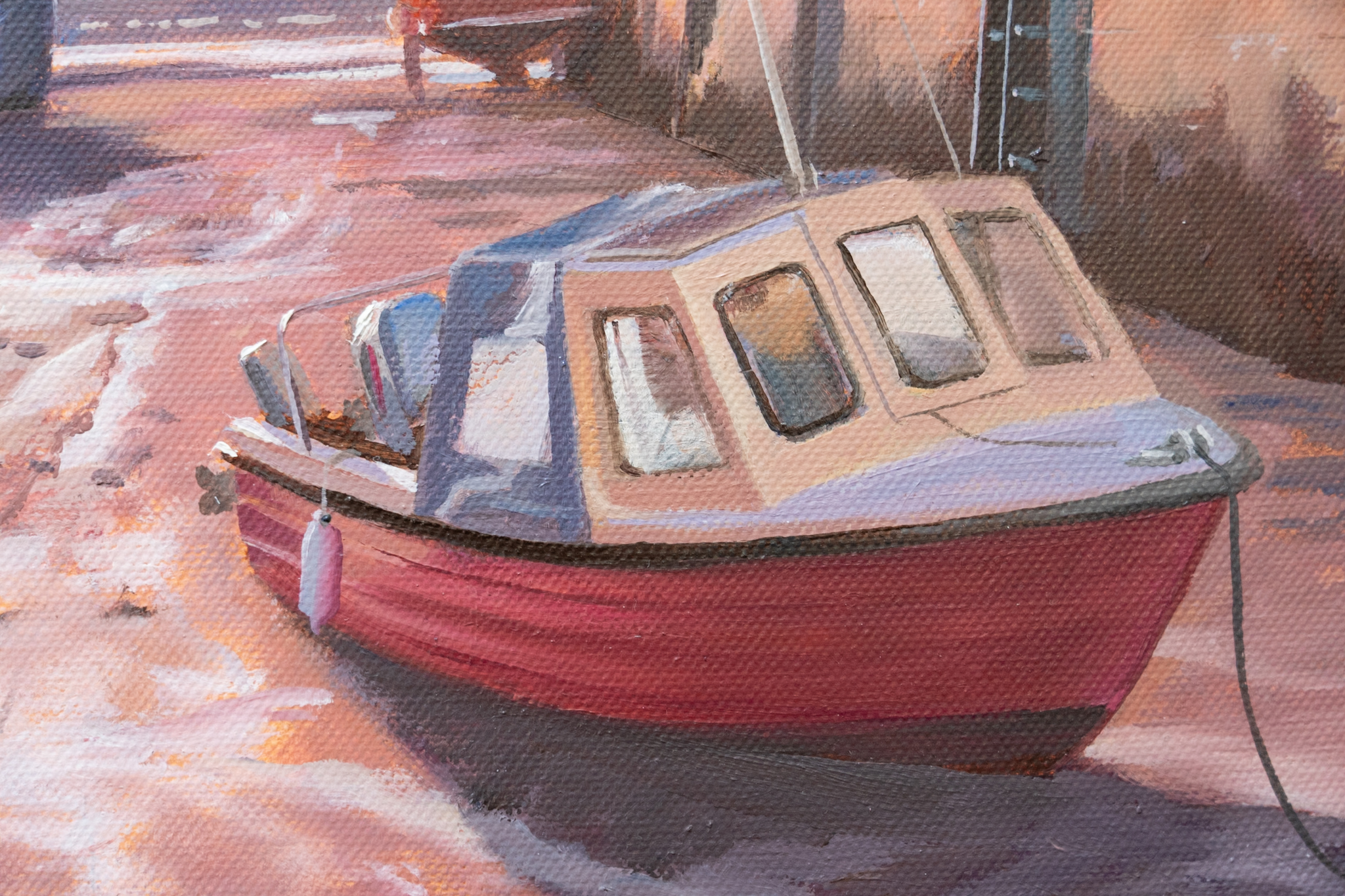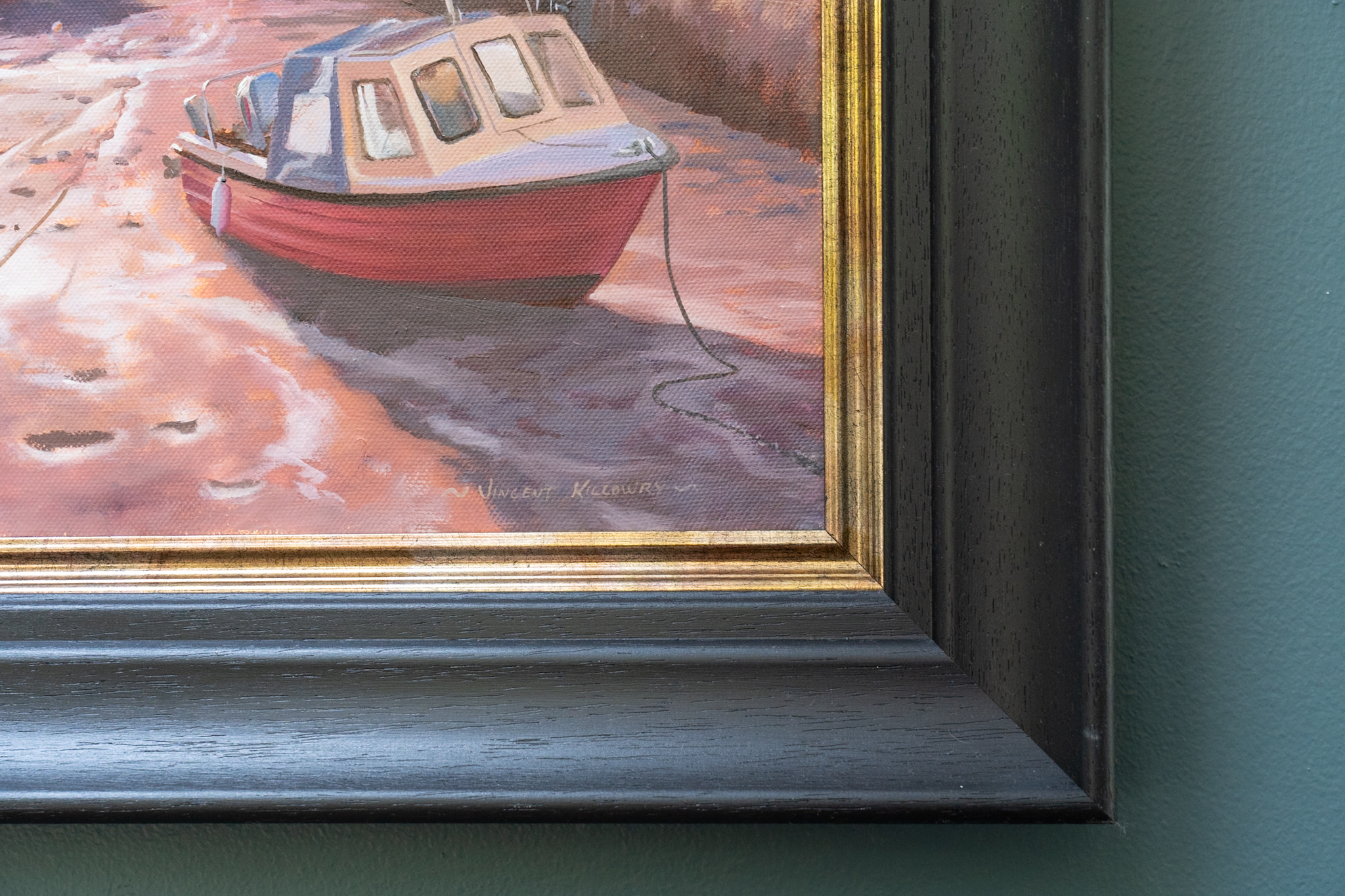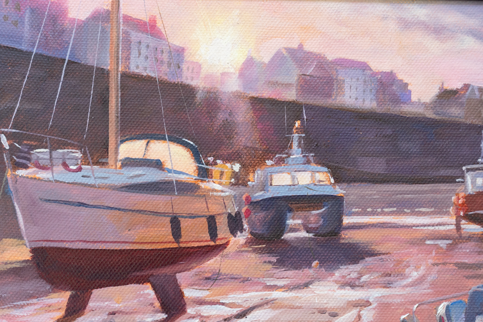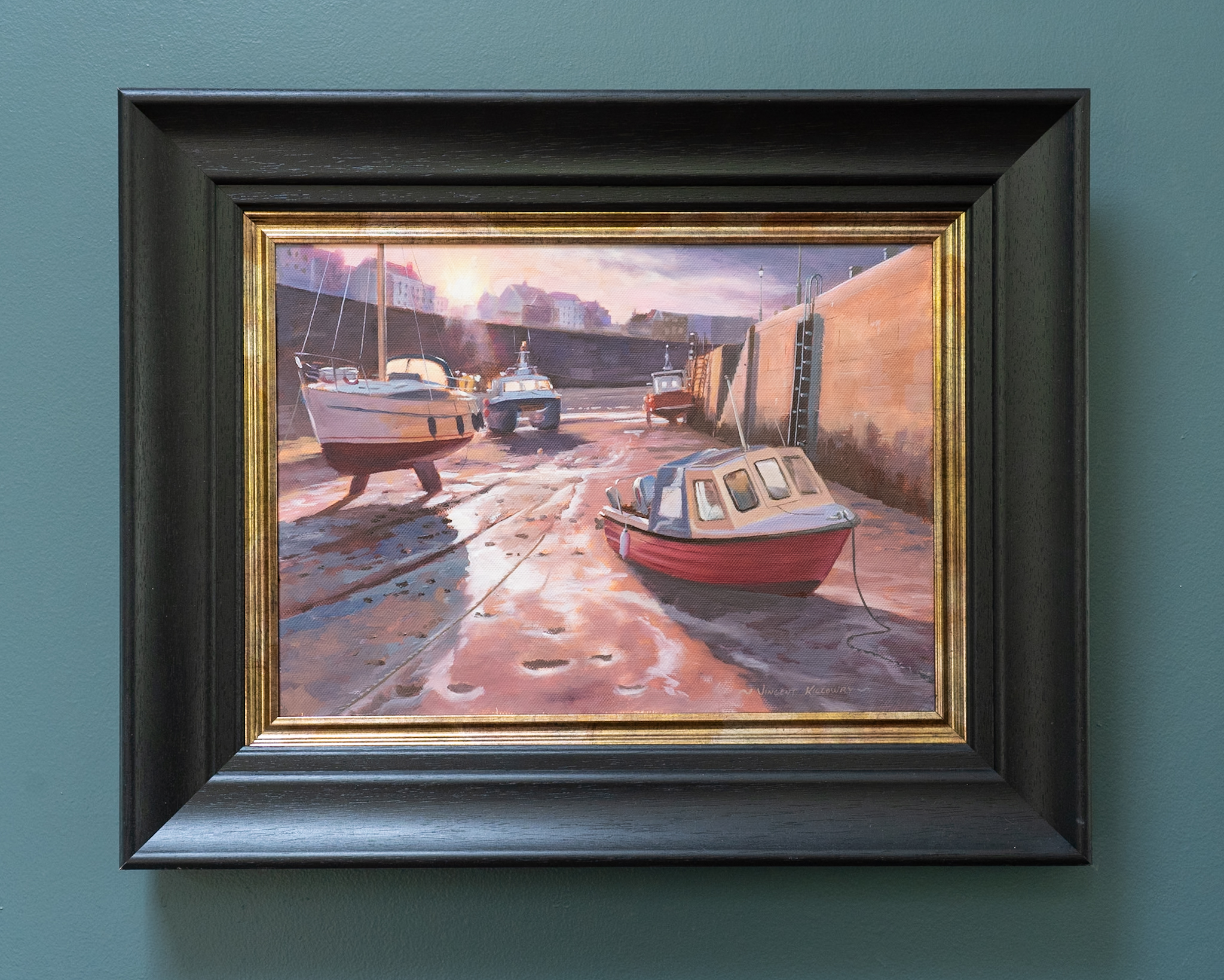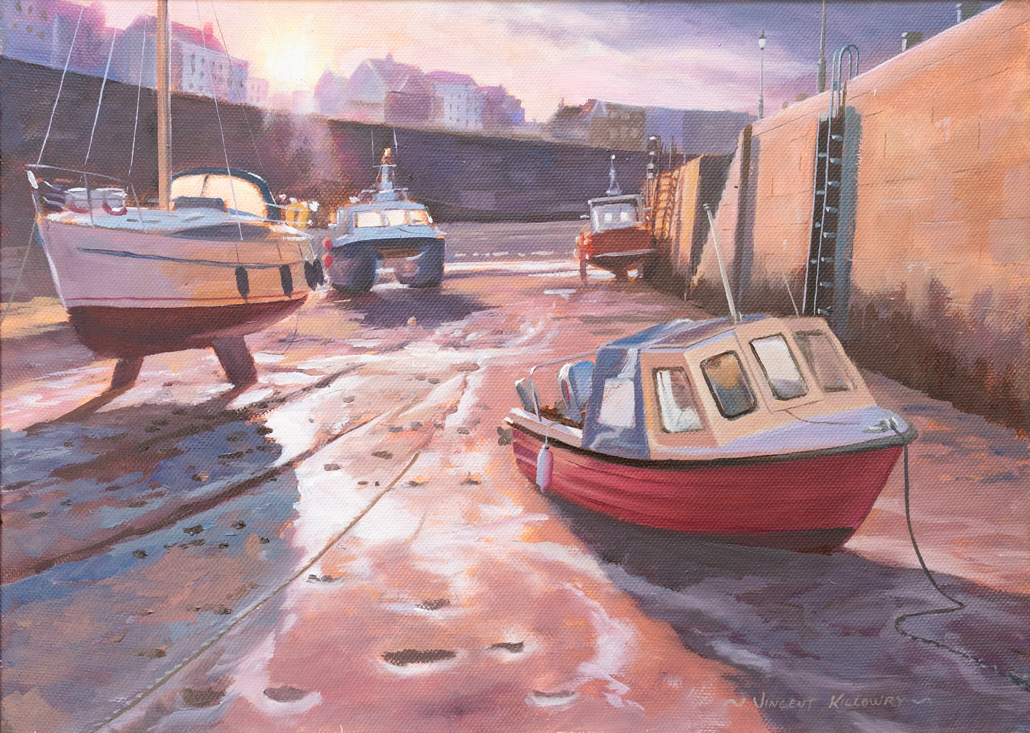 Another truly beautiful piece by contemporary artist, Vincent Killowry. You can feel yourself standing there, in that normally busy shipyard, quiet now, as evening falls; bathed in that gorgeous evening light, which casts a warm glow and reflects glimmers of light from the many tiny rivers of water in the sand below.