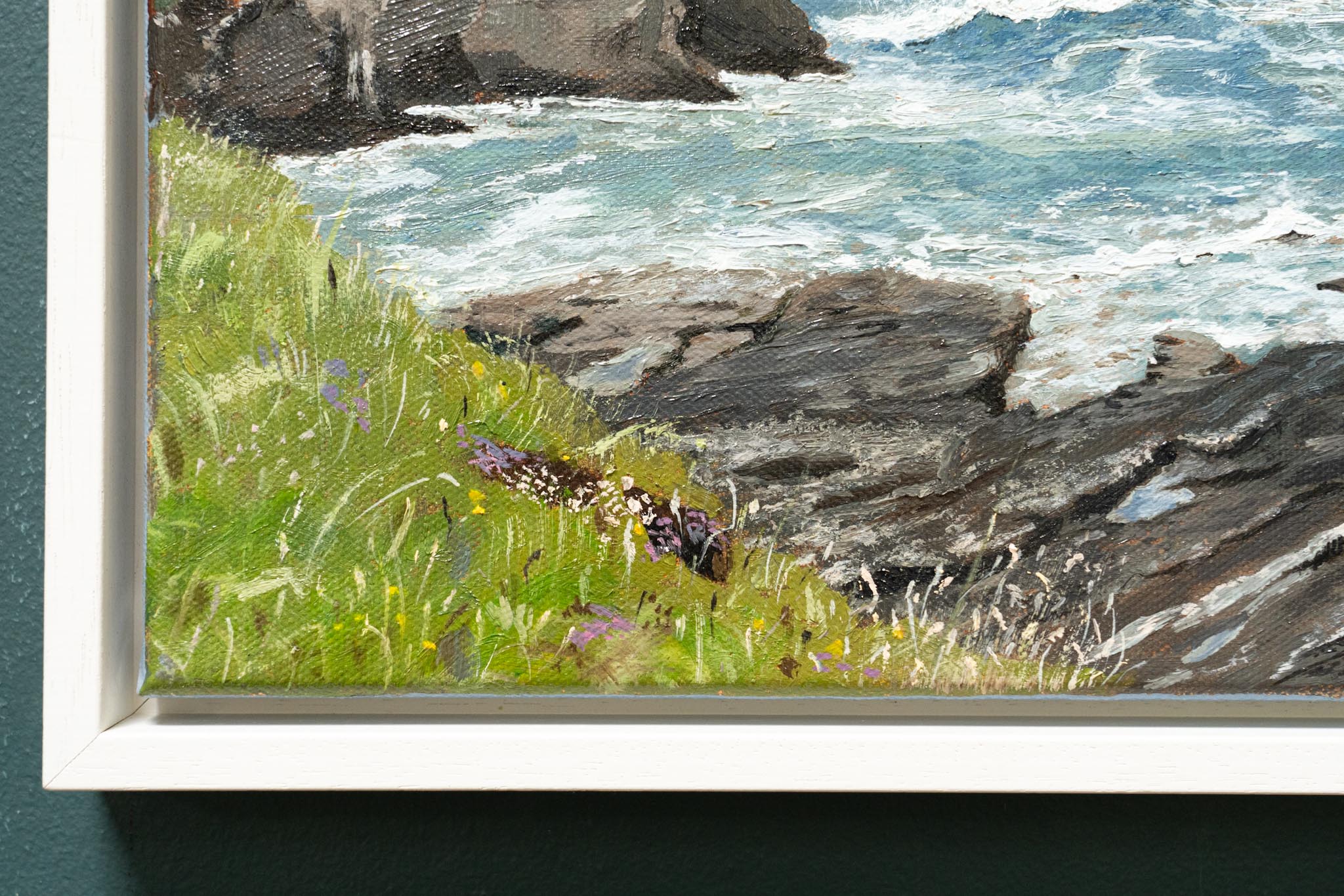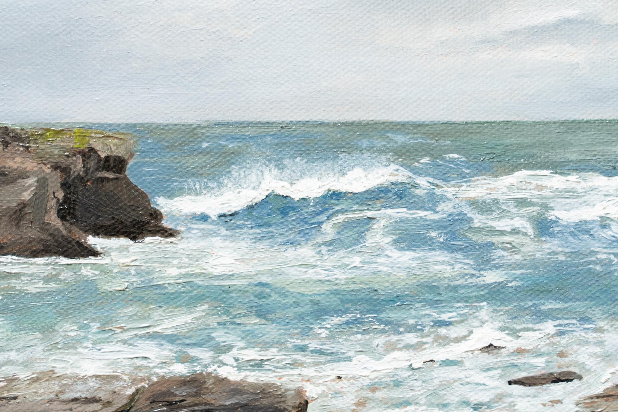 This is a striking oil on canvas original, of the famous view across the Bay at Ross (Loop Head Co Clare). The turbulent waves, making their way wildly ashore, so beautifully and accurately depicted here, crashing off the rocks.
