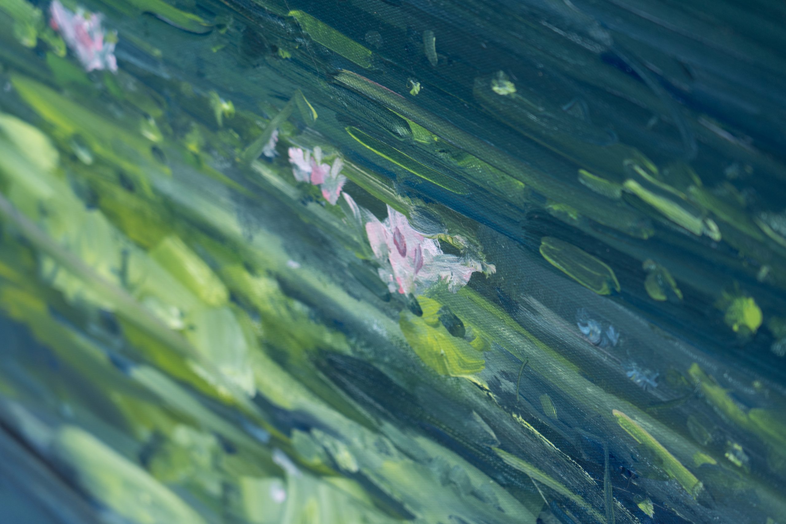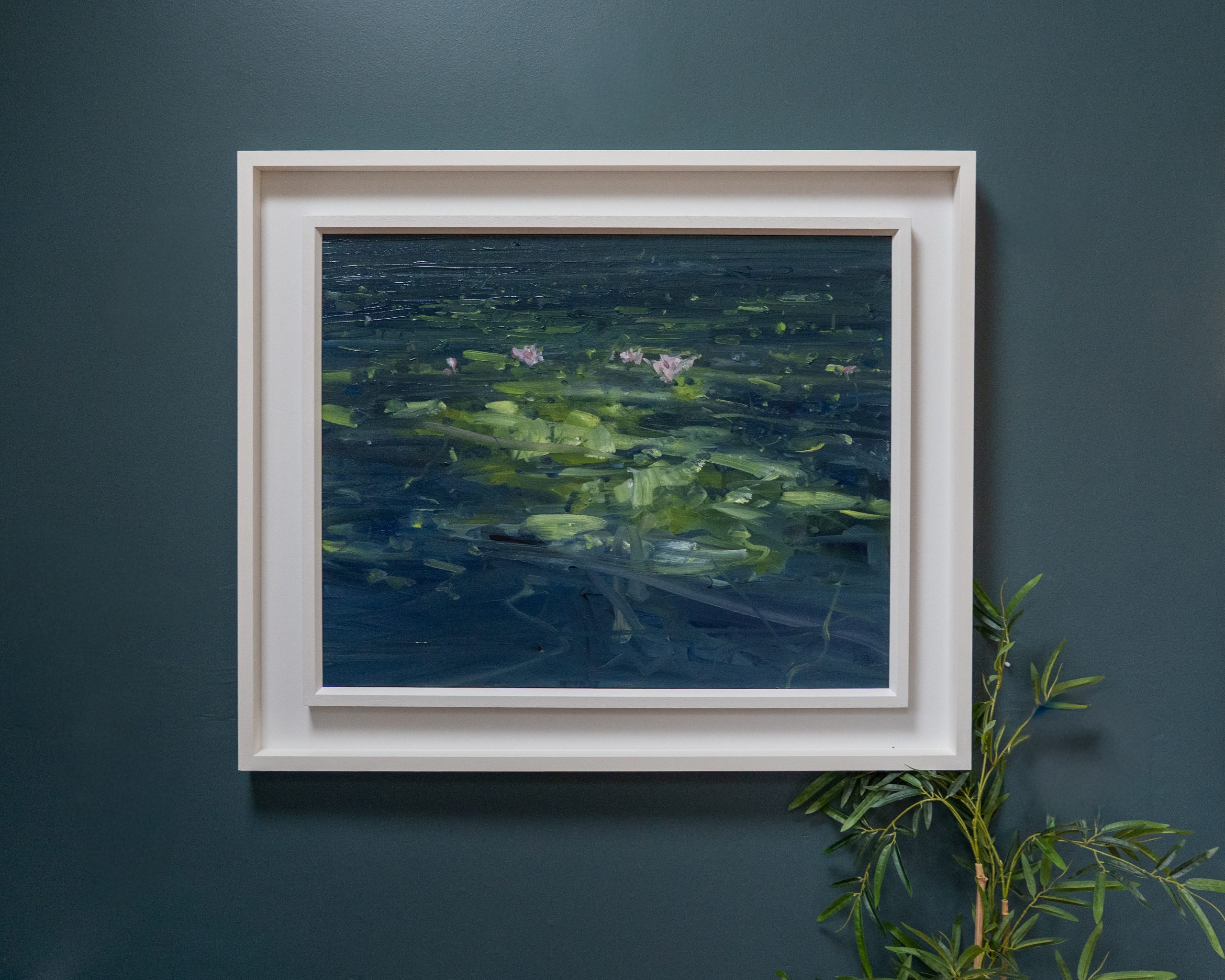 What a powerful piece of original art. With almost an impressionistic feel to it, this is a stunning depiction in oils of a gloomy pond, uplifted by the beautiful Waterlilies floating on top.