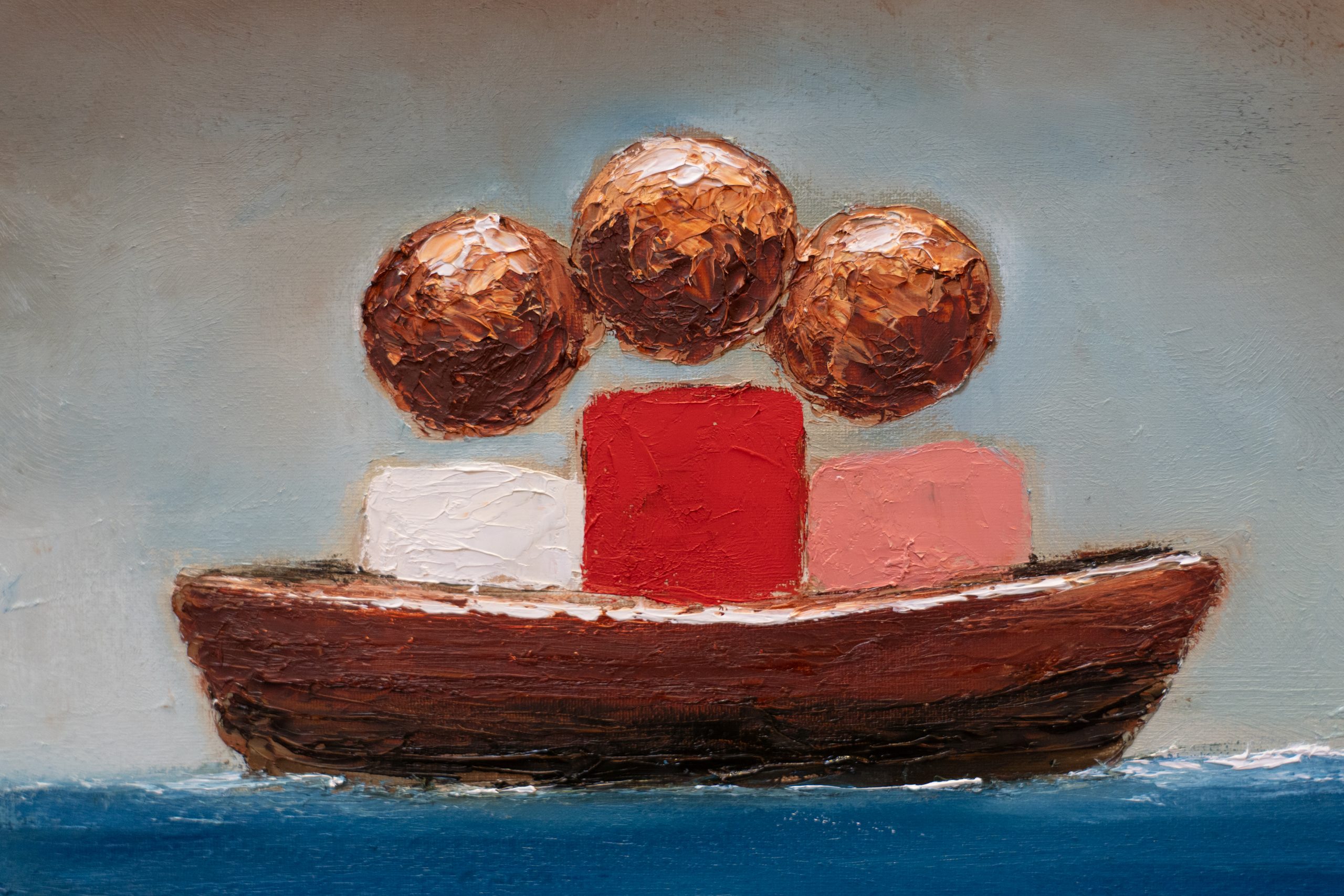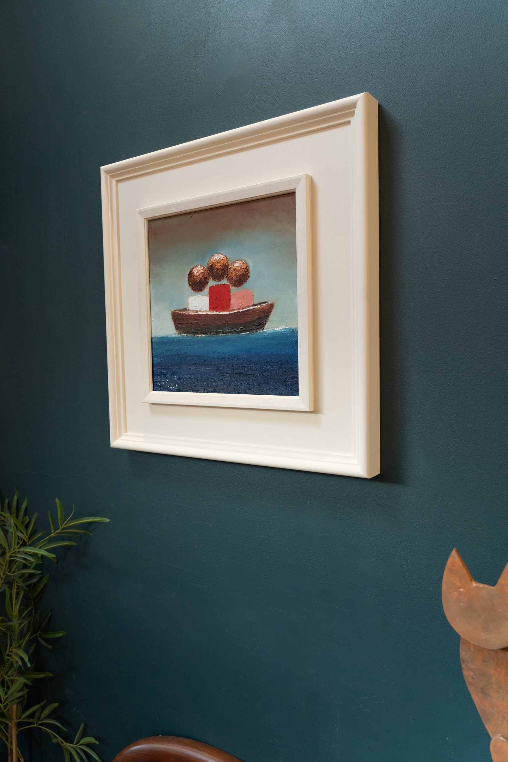 Known for his fabulously evocative paintings, this beautiful family of three, in McCaul’s signature contemporary style, seated shoulder to shoulder, in a boat together; symbolising them navigating the sometimes tumultuous journey of life. Painted against a beautiful backdrop of the McCaul signature colour palette.