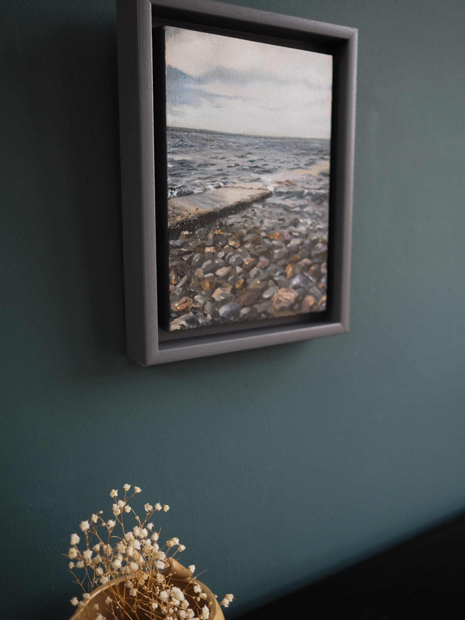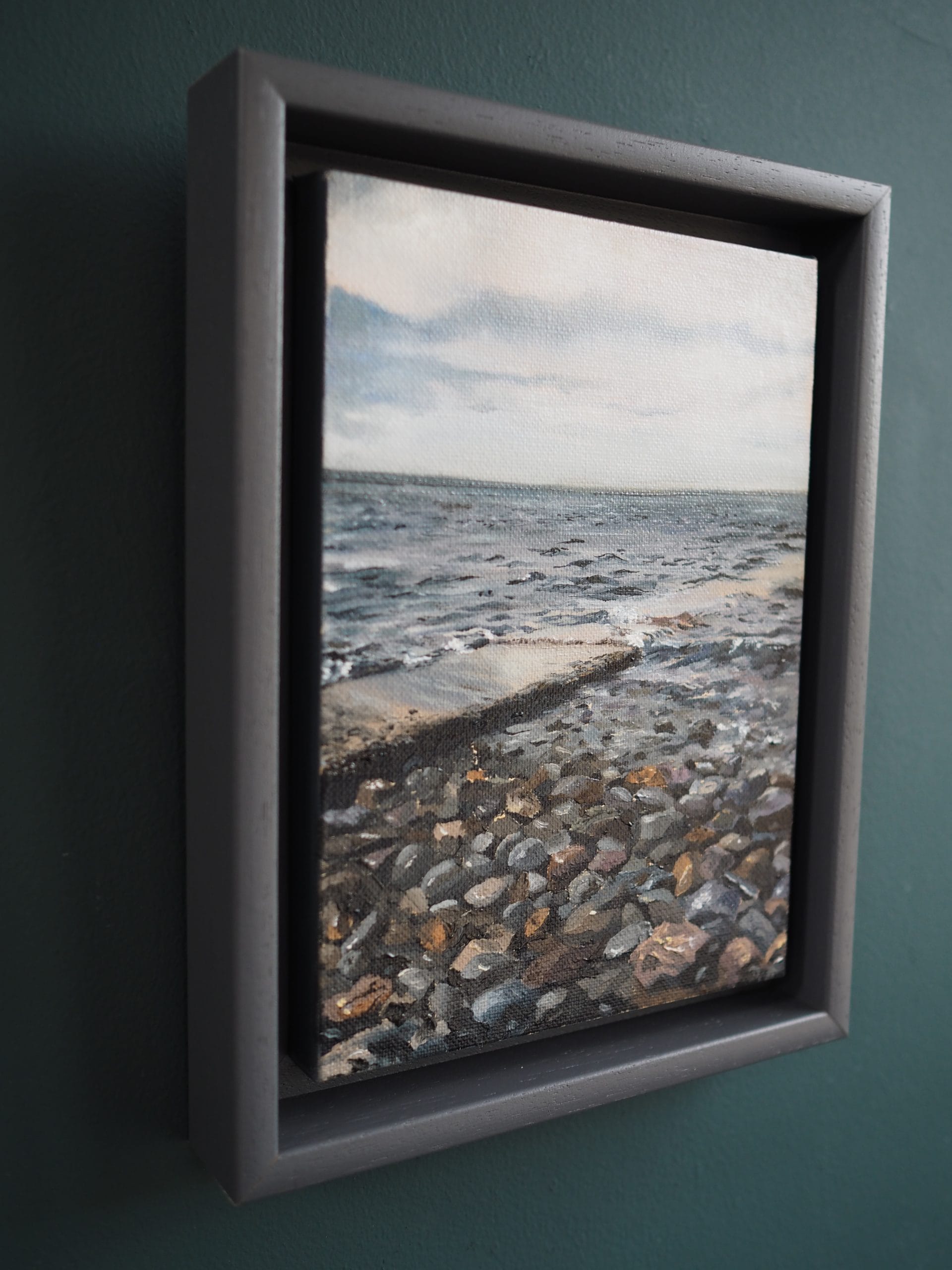 Lovers of Cappa, West Clare, will be very familiar with this popular swimming spot. ‘The Rock’, is a narrow strip of concrete that stretches out into the water, famous for providing easy access for swimmers across the stony beach and into the sea (the Shannon Estuary). The West Clare artist, signing their work as ‘D’, has captured this well known landmark in oils on canvas, with expert precision and wonderful detail. The clarity of the water and in particular, this gorgeous aspect across the Shannon almost lures you in to the very painting itself.