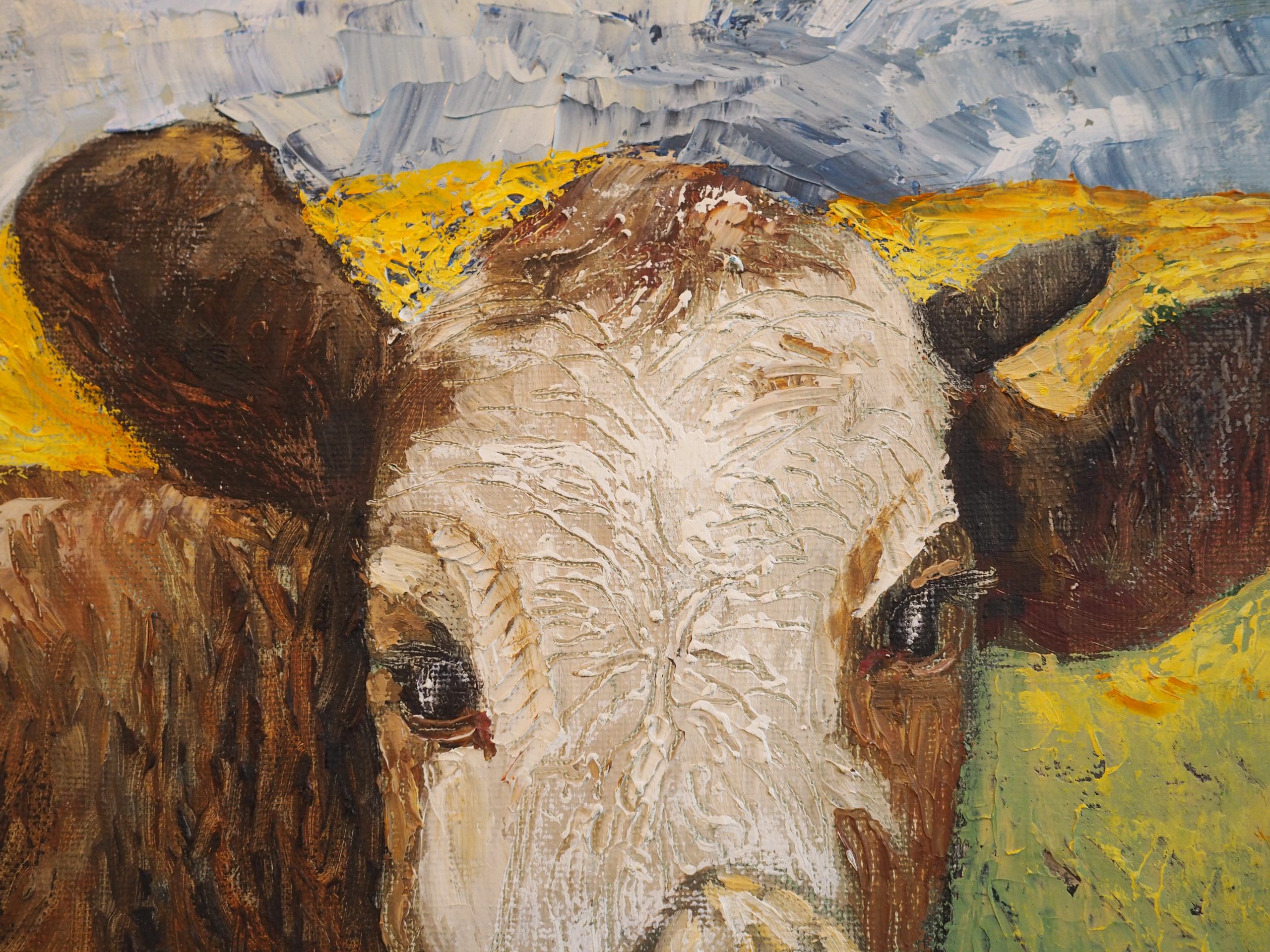 This is such an adorable oil painting by artist Eadaoin Harding Kemp. One of Eadaoin’s signature stamps is her ability to pull the most important focus straight into the very immediate foreground – and she has done so with these gorgeous Burren Cows. Her strong lines, deliberate brush strokes and lovely rustic colour palette, are all wonderfully handled by this West Cork artist.