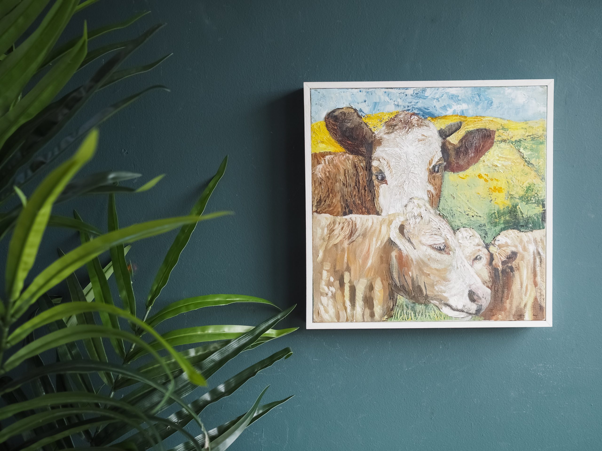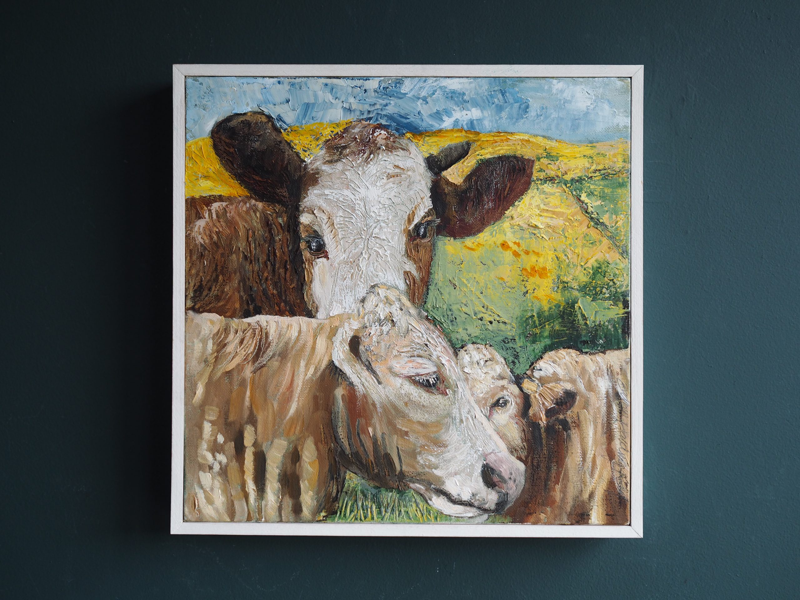 Irish contemporary art – contemporary artist – cows – framed work – original art – rural Ireland – West of Ireland – small piece – square –