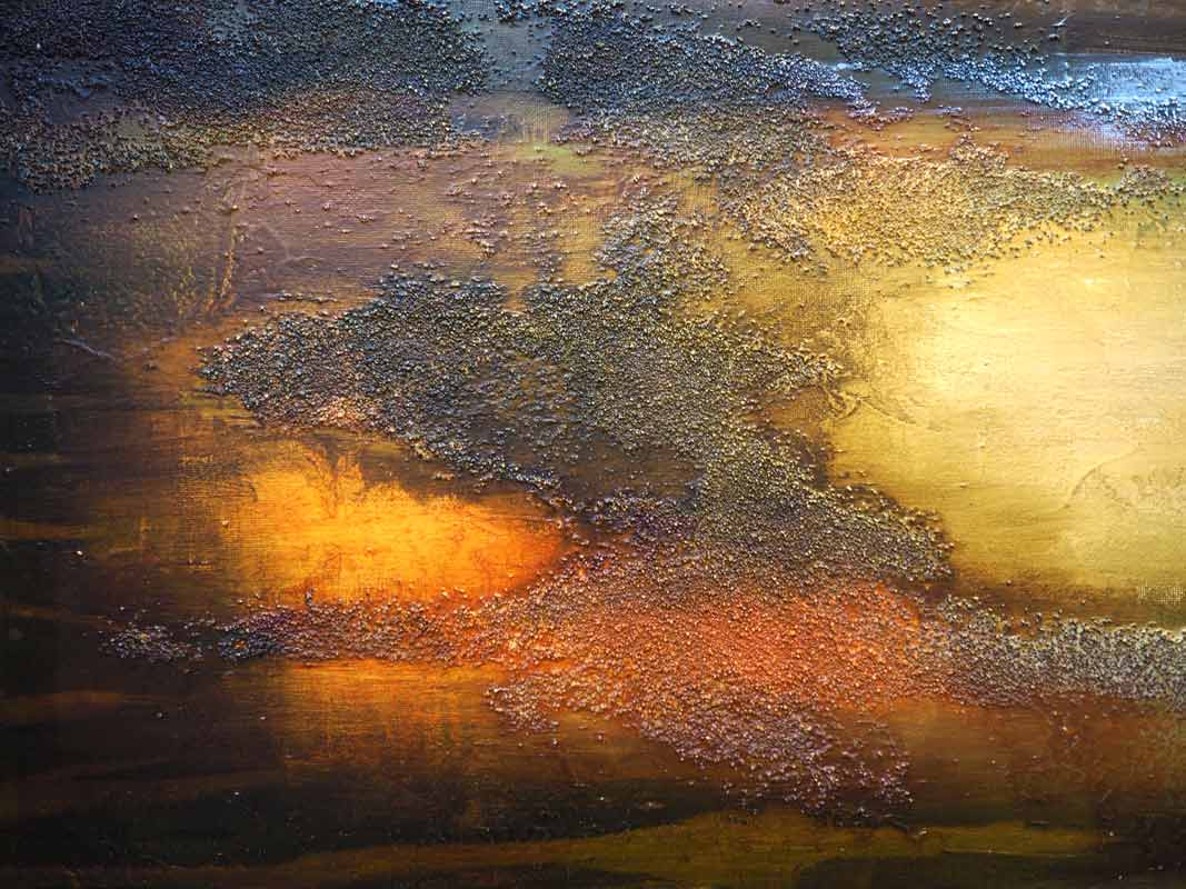 Oh this is one of our current gallery favourites. At a rather large 41 inches square (yes that’s over a metre squared!) this incredible painting is a combination of mixed media and acrylics. ‘Turlough’ is enhanced in JUST the perfect smattering of places by a layering of sand and other dust like materials across the lower half of the painting – which gives an incredible sense of depth and texture to the painting. Have a closer look in our images here, to truly get a sense of this.