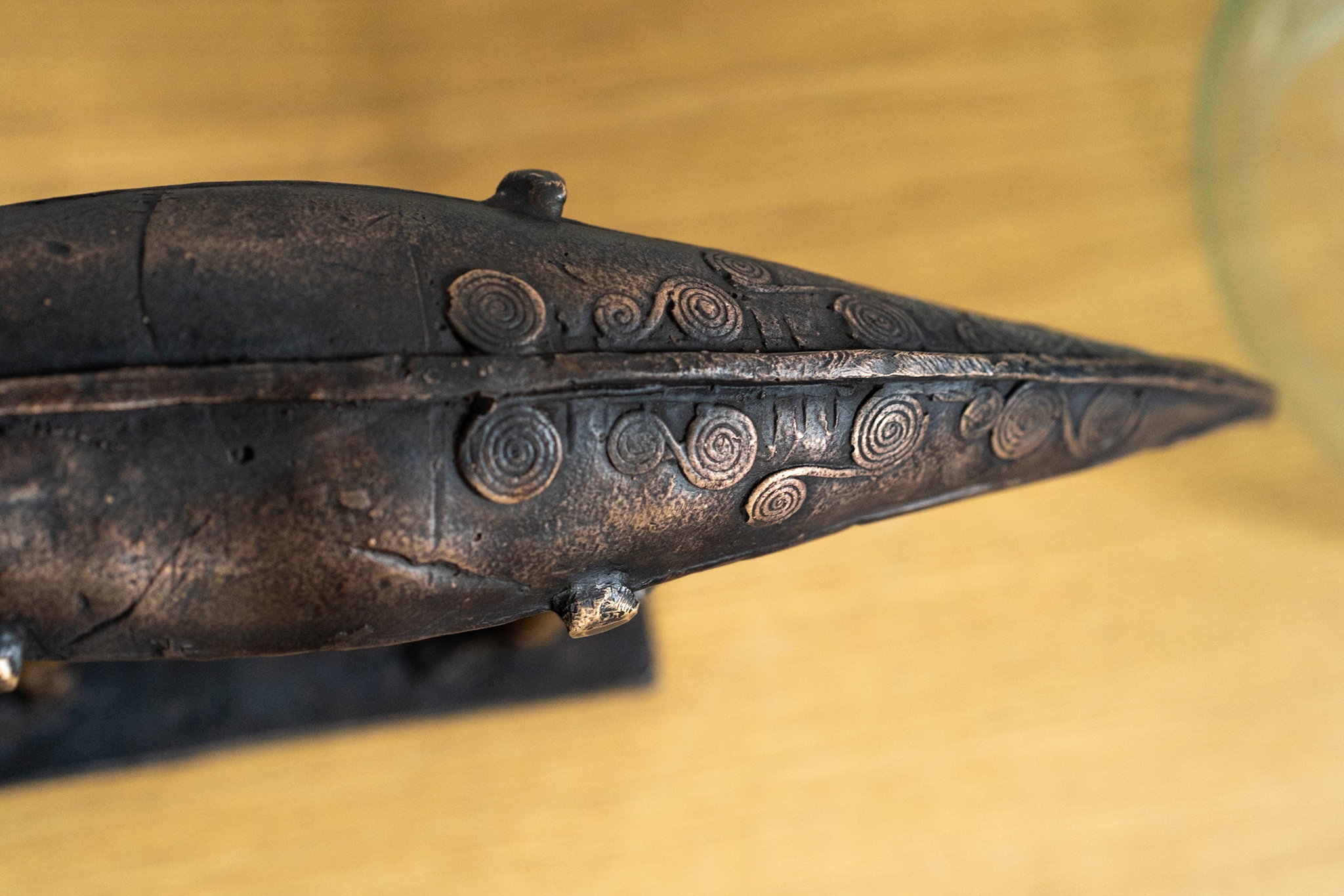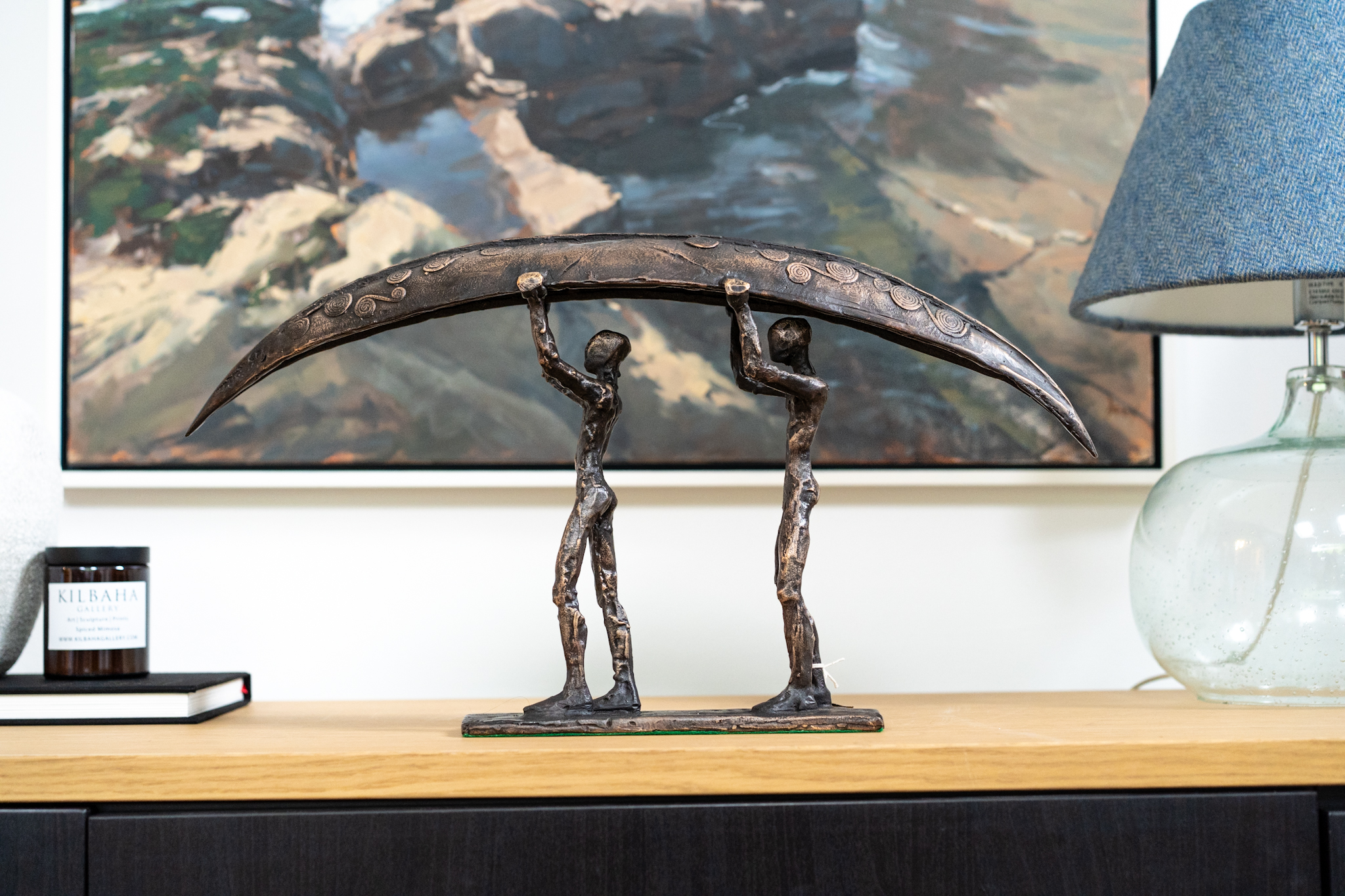 Bronze sculpture, currach being carried by two male figures.