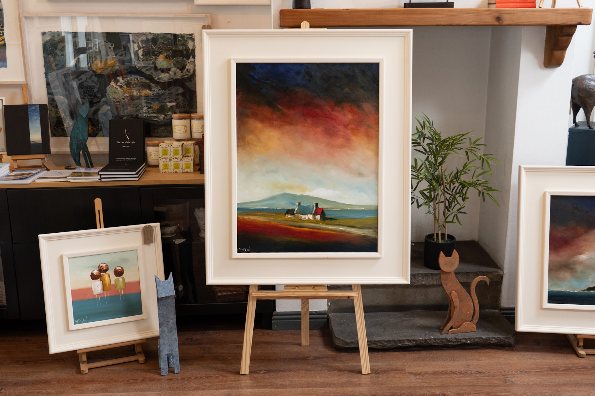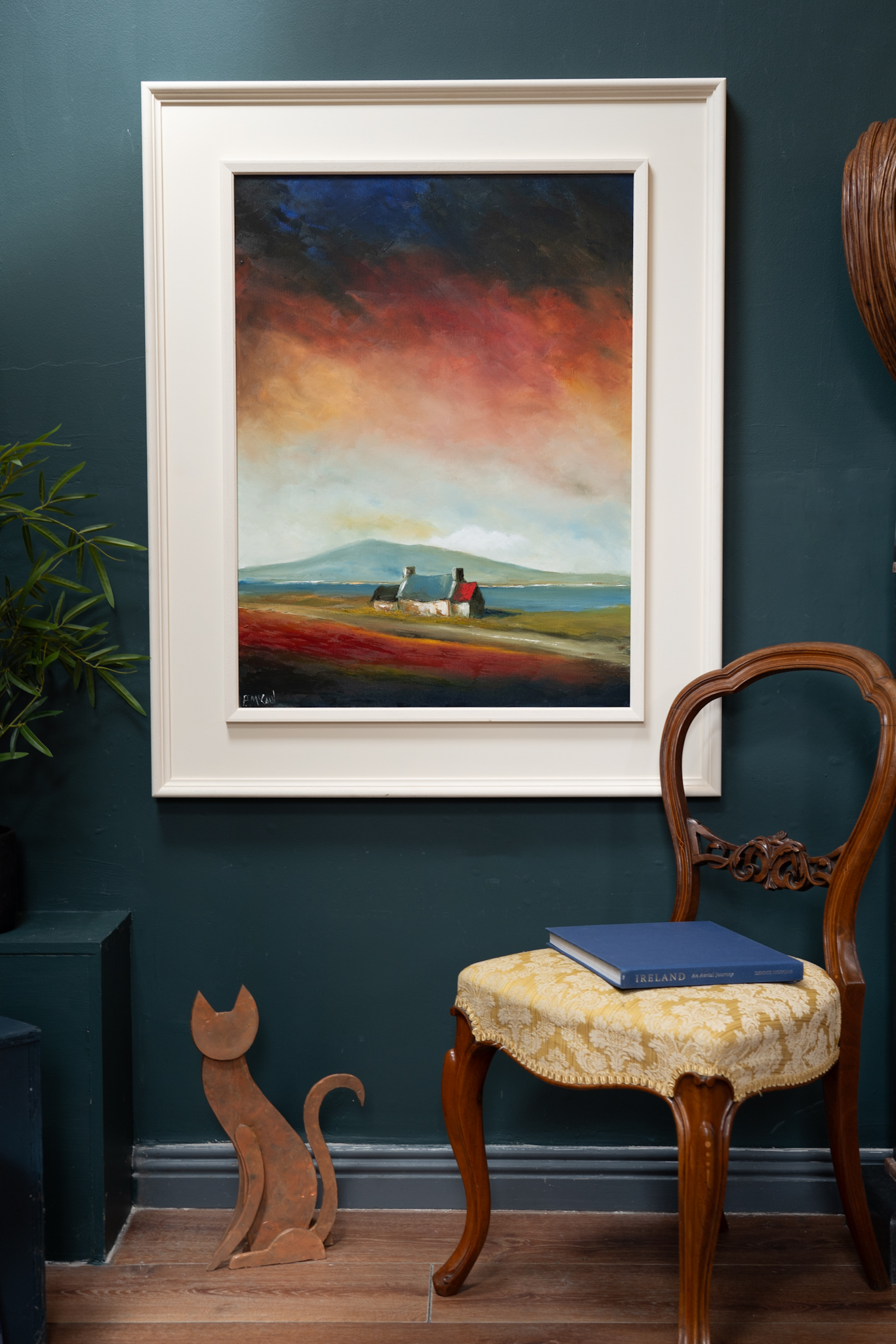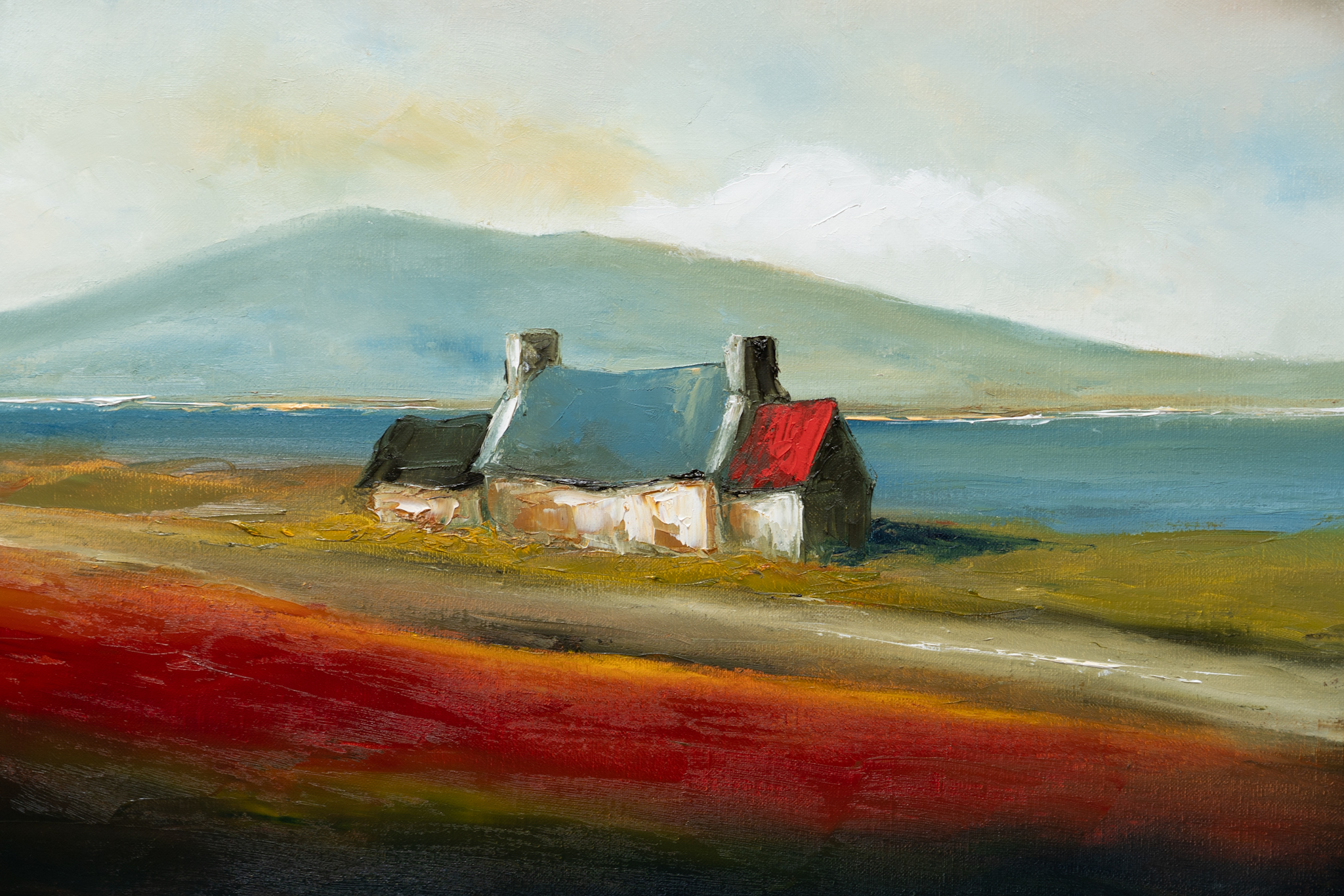 A super strong and powerful piece of original art from Padraig McCaul. The sweet farmhouse cottage, nestled gently in the landscape, under what truly is a spectacular and moody evening sky. A departure in materials, this particular piece has been painted on linen and the result was a much heavier layering of the oils. The burnt orange clouds, morphing into black and with extraordinary splash of midnight blue in the top left corner are exquisite.