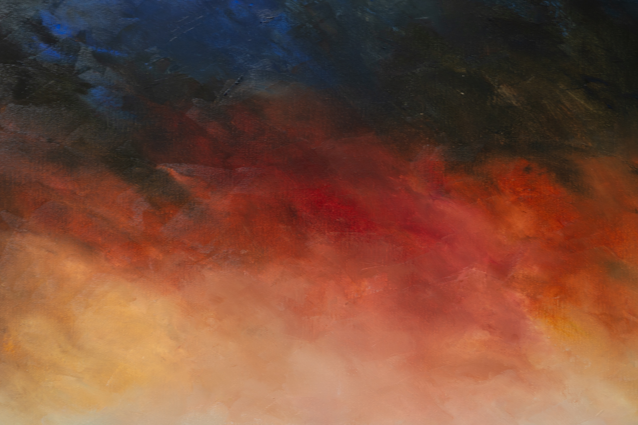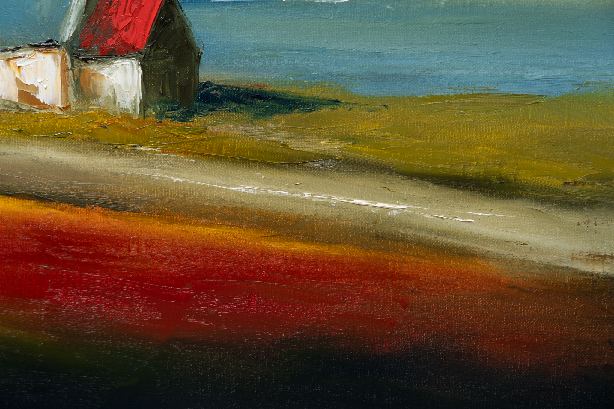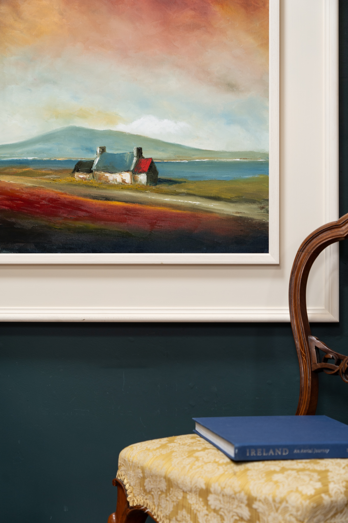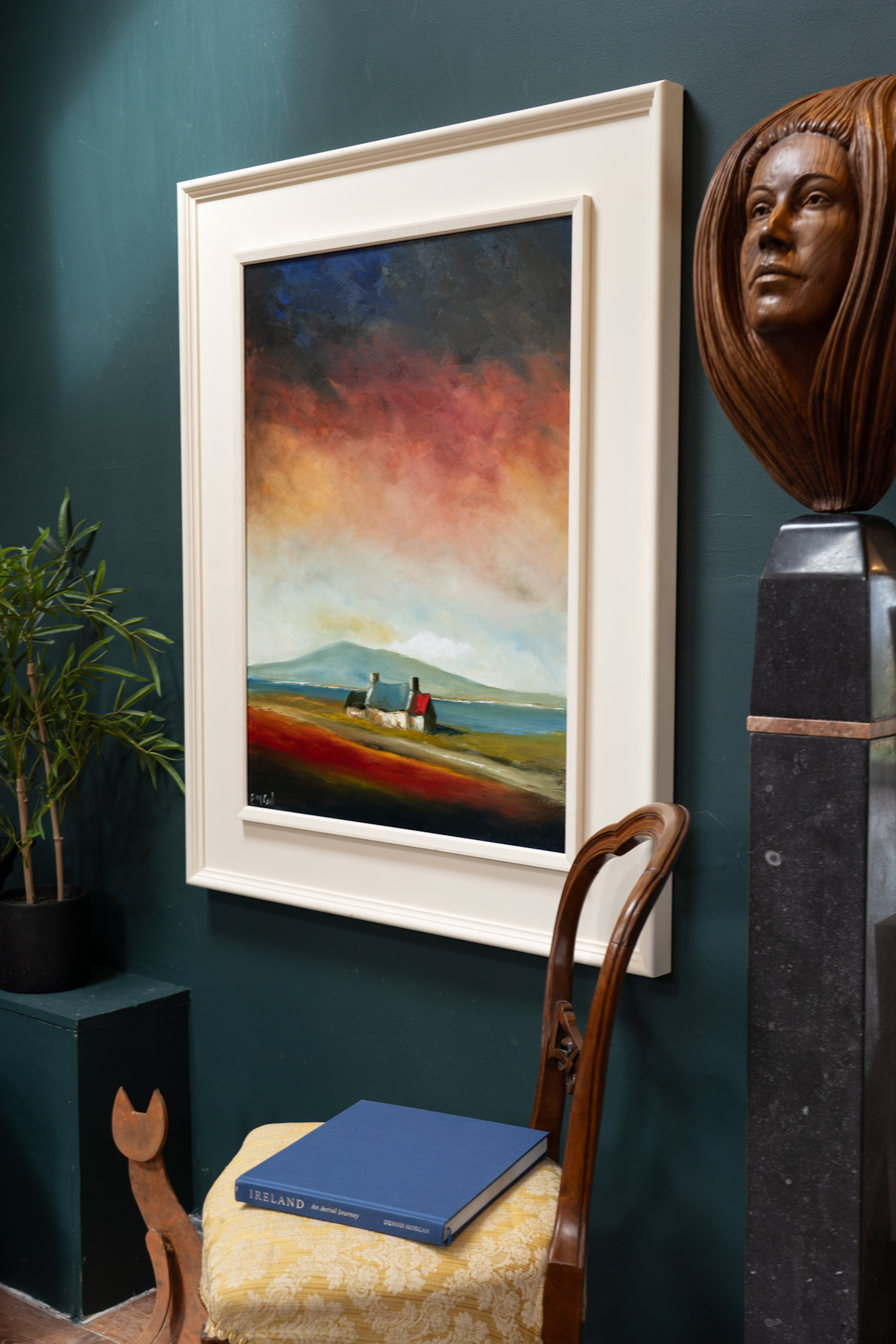 A super strong and powerful piece of original art from Padraig McCaul. The sweet farmhouse cottage, nestled gently in the landscape, under what truly is a spectacular and moody evening sky. A departure in materials, this particular piece has been painted on linen and the result was a much heavier layering of the oils. The burnt orange clouds, morphing into black and with extraordinary splash of midnight blue in the top left corner are exquisite.