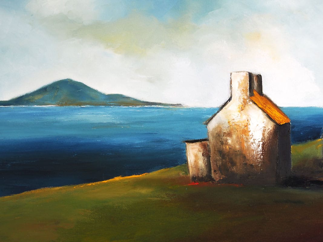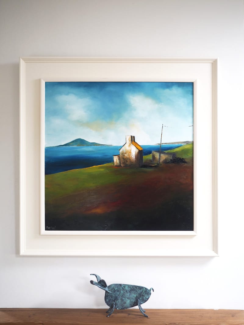 One of Padraig’s bigger pieces, this absolutely fantastic original oil on canvas, sits strikingly atop the proudest space in the gallery; over our main fireplace. It’s colour palette is both vibrant and oh so authentic to the moody ‘Achill Beg’ view it depicts. Framed beautifully, this piece – especially considering its sheer size – would make a marvellous addition to an airy reception area, either in a private home or a public thoroughfare. Padraig visited our gallery personally to drop this off. To say it took our breath away would be an understatement. Please spend some time looking at this painting in our image gallery here to truly absorb its scale and its beauty.