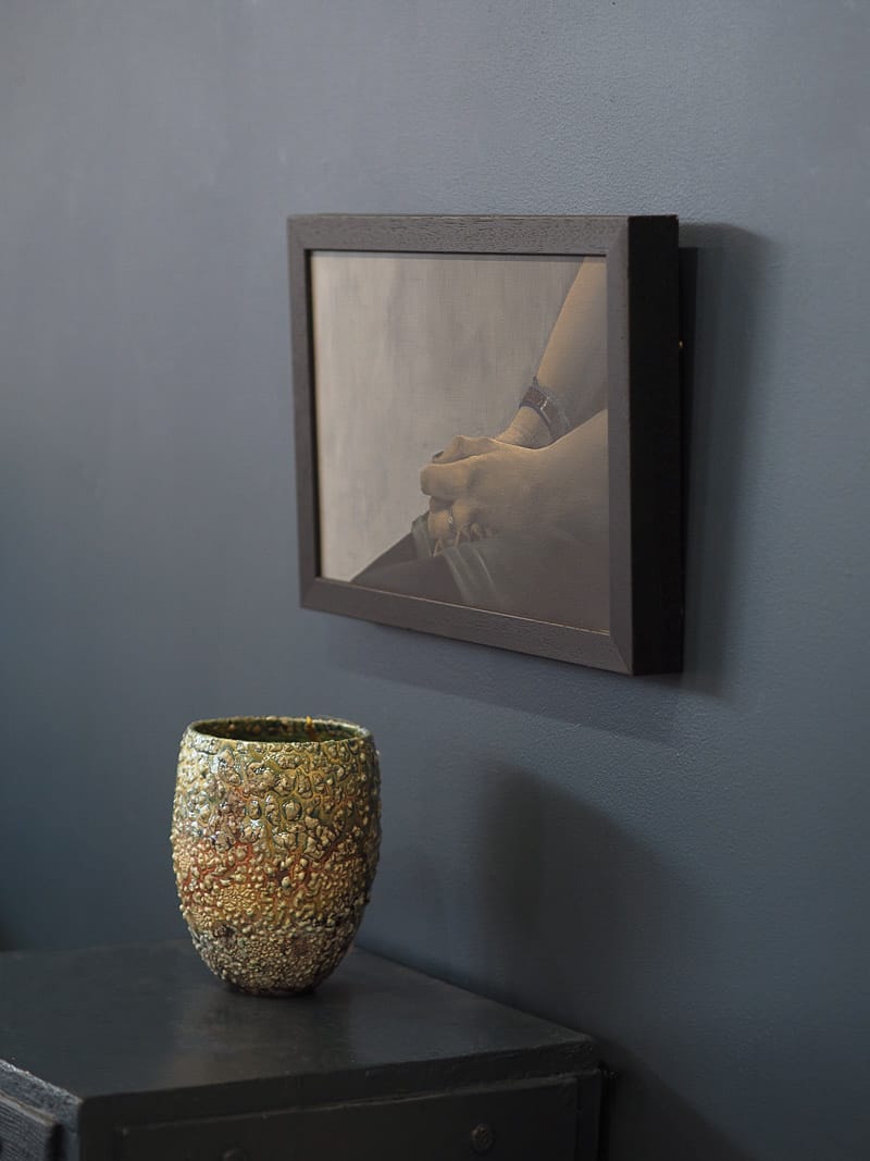 ‘Hands (Waiting Study)’ – Silence, darkness, calm and quiet. Waiting, hands clasped – anxiety? Excitement maybe? Why? Waiting for whom? So many questions can be derived from such a painting – a moment in time. Pomeroy’s delicate strokes make for a flawless finish in this, the clasped hands of the girl in waiting.