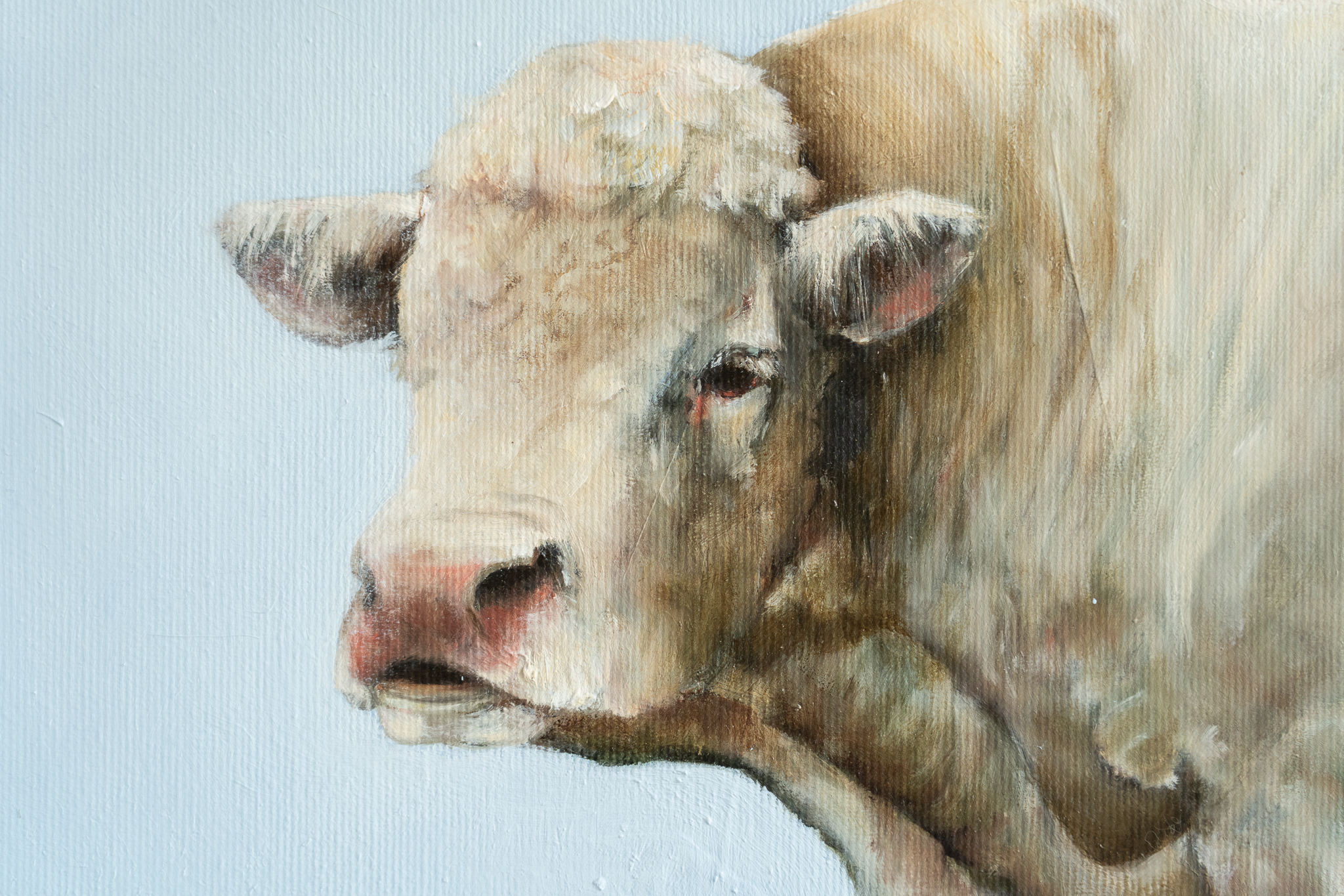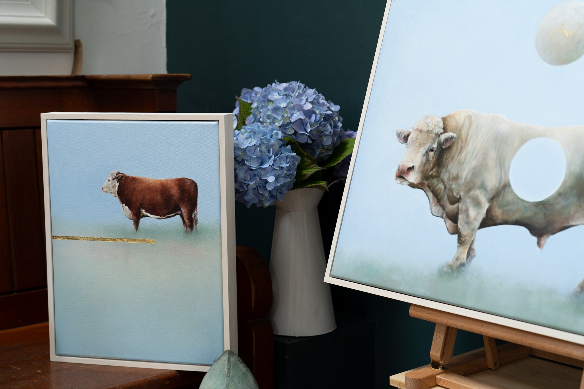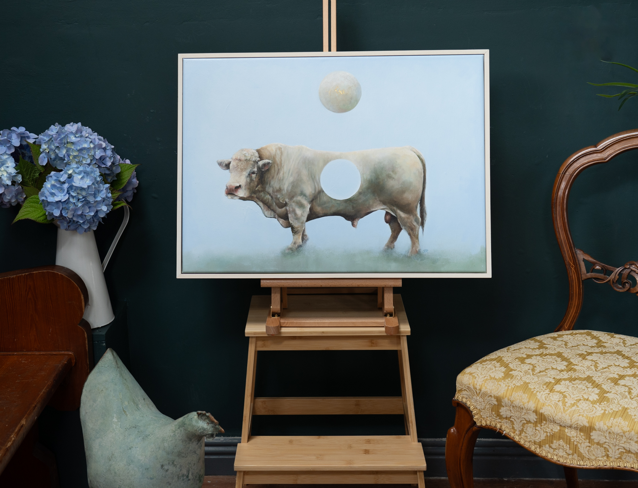 ‘Whole’ is a beautiful, play on words, where the bull takes prime position on the canvas, against a cloud-like background; the whole of the moon, leaving a ‘hole’ in this rather superb looking specimen.
