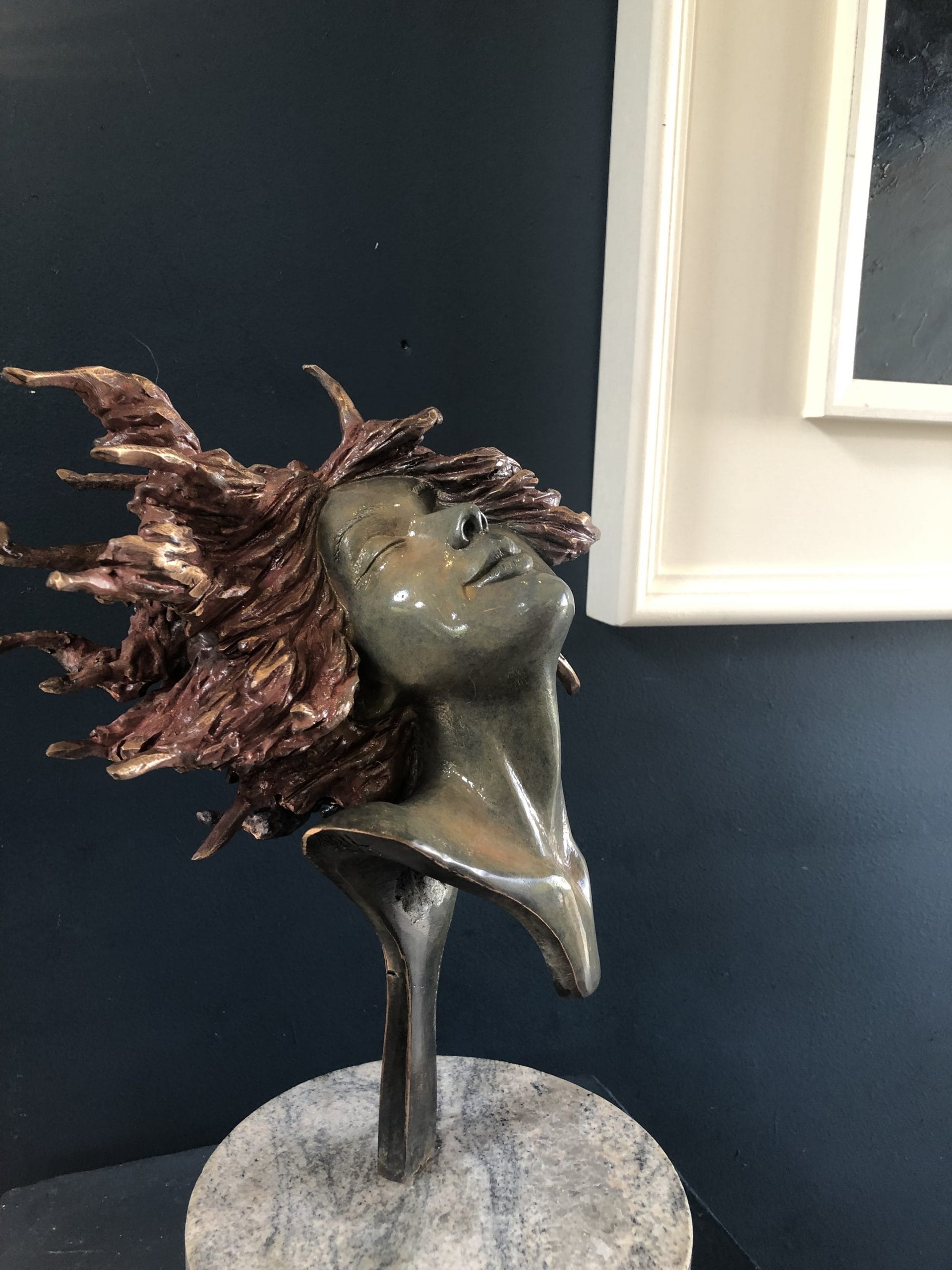 Another totally arresting sculpture by the artist Adil Vezir. Sculpted and cast here in Clare, this truly mesmerizing piece is of a windswept beauty; a lady strongly connected with the sea, the Atlantic, the Coast; her dark patina is strikingly strong, has amazing depth and is expertly applied. Adil’s eye for detail and structure is evident, as this particular piece looks slightly different from every angle and also is placed on a stone base in such a way as though it appears to be almost floating. This is the kind of sculpture that would stand proudly on a plinth or console table in any grand entrance or foyer.