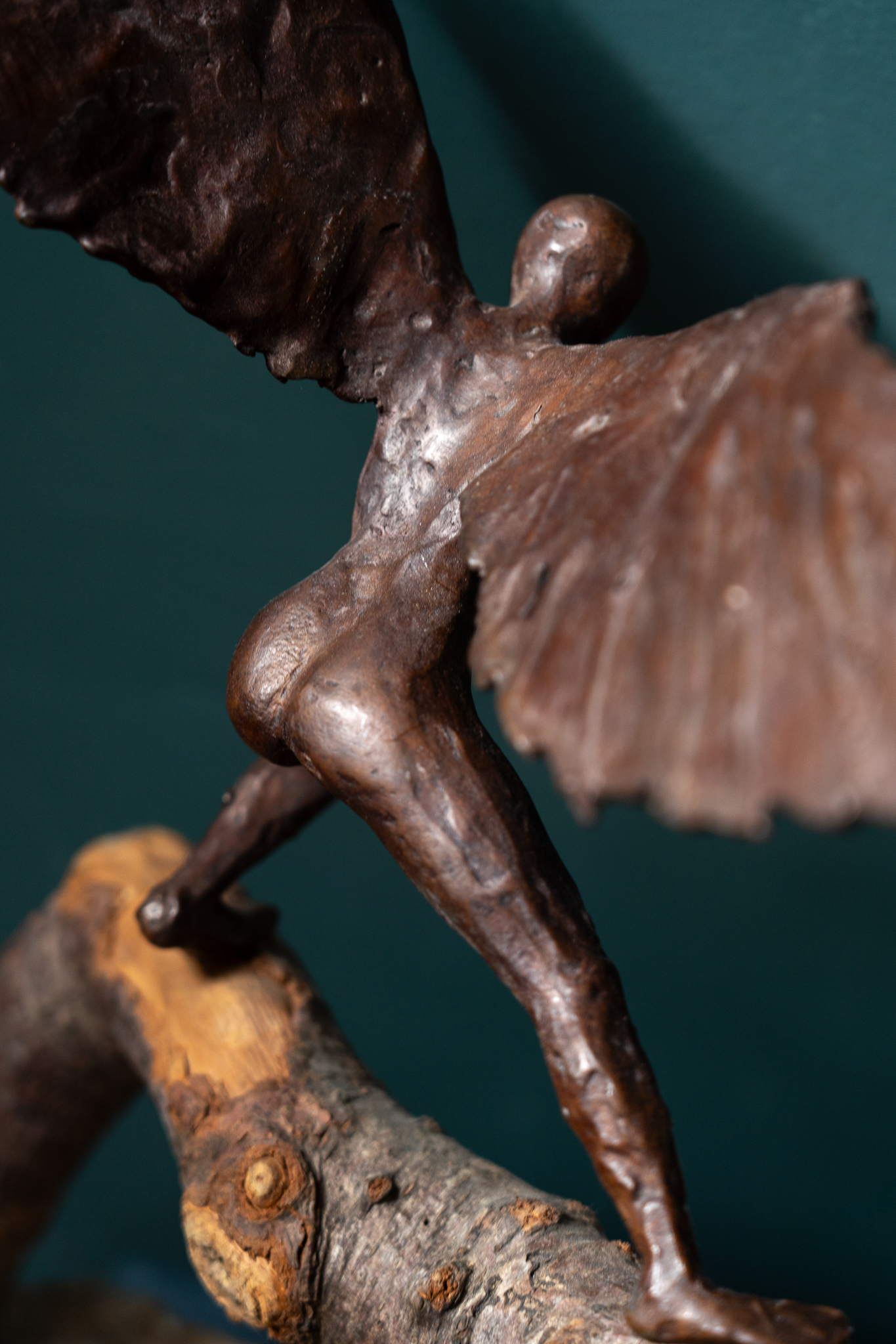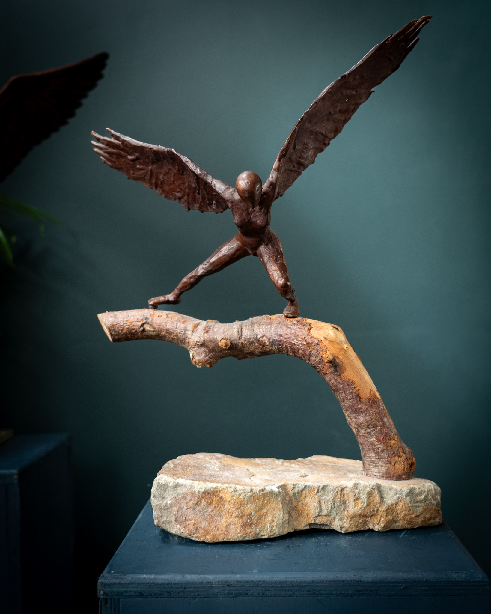 19″(49cm) tall x a wingspan of 15″(38cm) and a depth of 6.5″(16cm) – bronze sculpture, set in wood and onto a stone base.