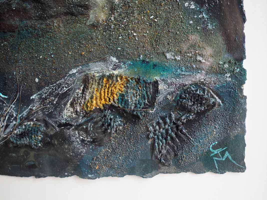 For those of us who are familiar with Madigan’s rather incredible knowledge of the seashore (she is the author of a factual book on the topic of the seasons and species of a rocky shore and is approved by the Marine Institute to teach this), her rock pool paintings are, we know, something of a phenomenon. They are generally mixed media pieces and totally draw you immediately to the shoreline. Previous rockpool paintings have been bought up by the OPW and indeed have been sold internationally to art buyers. Carmel doesn’t normally use dark colors in her work but in this case, it’s perfectly fitting and in fact, lends a rather exciting and dramatic element to the work. Nicely complemented by the teals, greys and whites that one would associate with the little rocks pools discovered on a winter stroll along the shoreline.