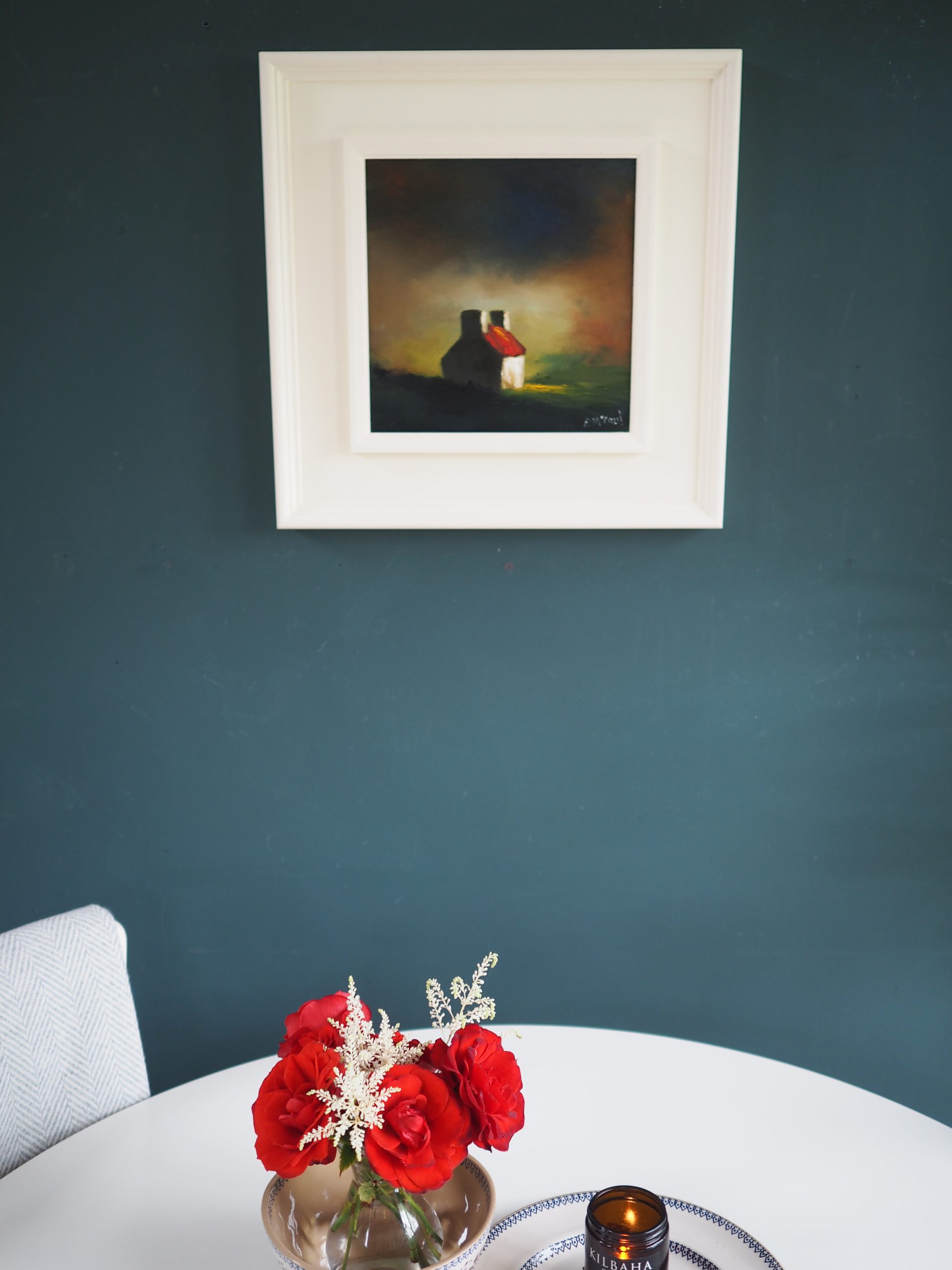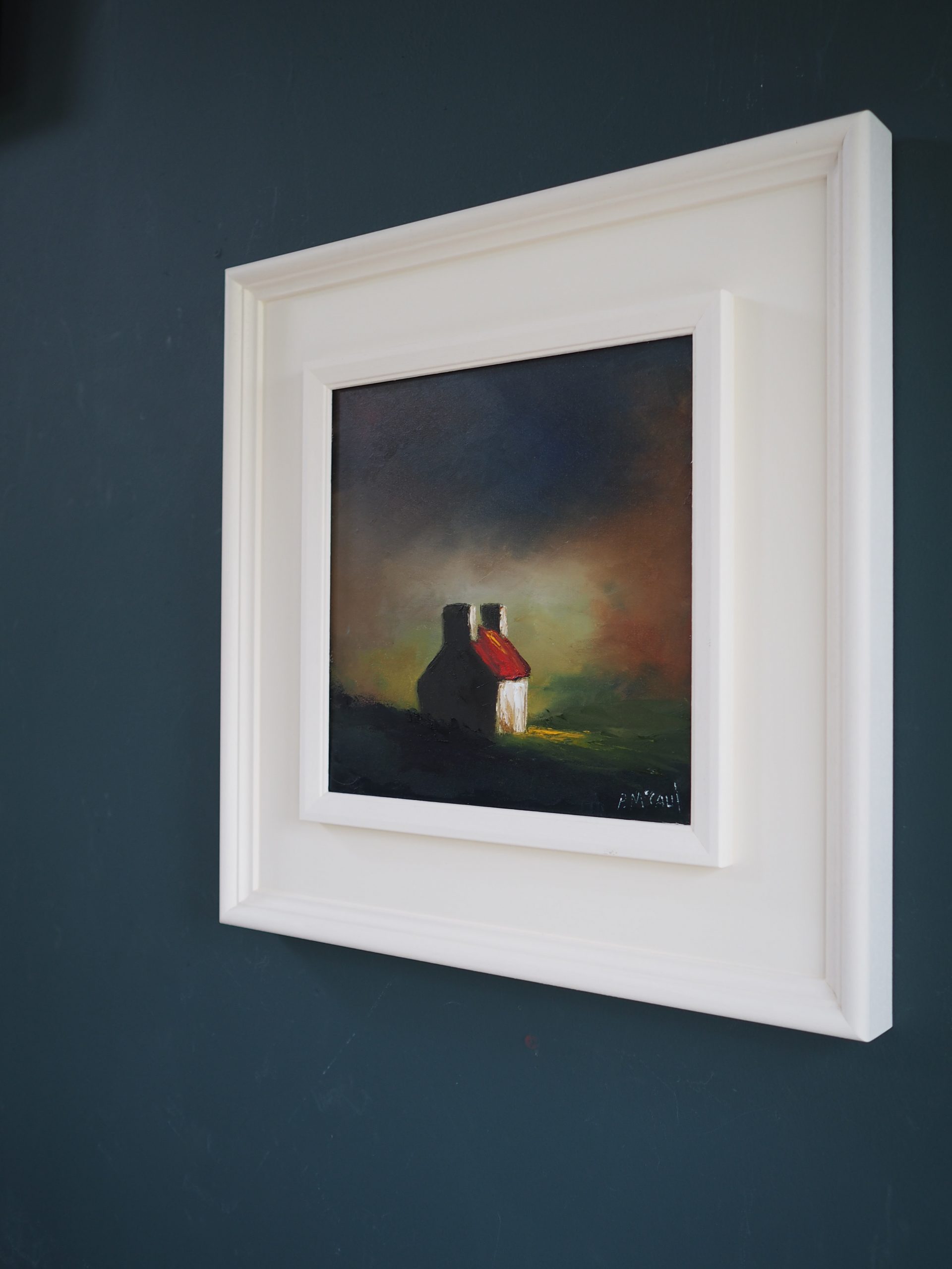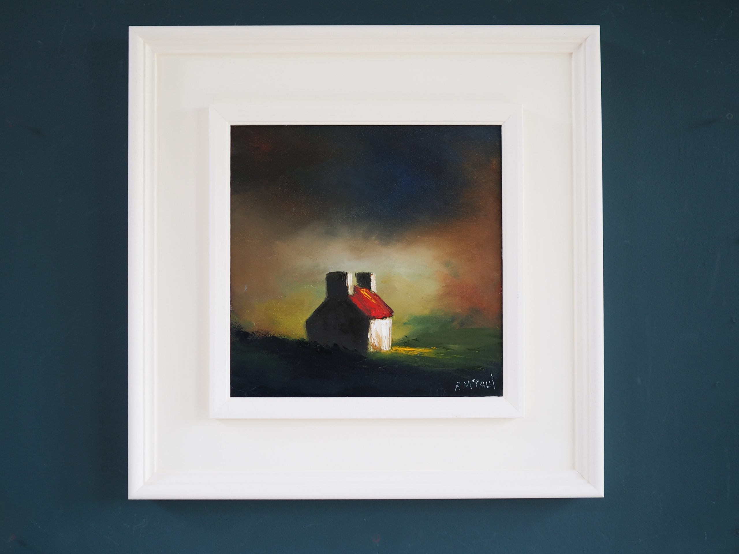 This painting really and truly is very striking on the wall. McCaul’s handling of colour is extraordinary. You get a real sense of home, with this painting of a farmhouse, nestled into the countryside, with darkness falling and a kind of glow emanating from the house that we feel symbolises warmth, family and cosiness. Padraig’s work is so evocative; he manages to make even the simplest of subject matters give us ‘the feels’ – evoking all kinds of emotions as we, the viewer, somehow immediately create our own narrative around what the painting means.